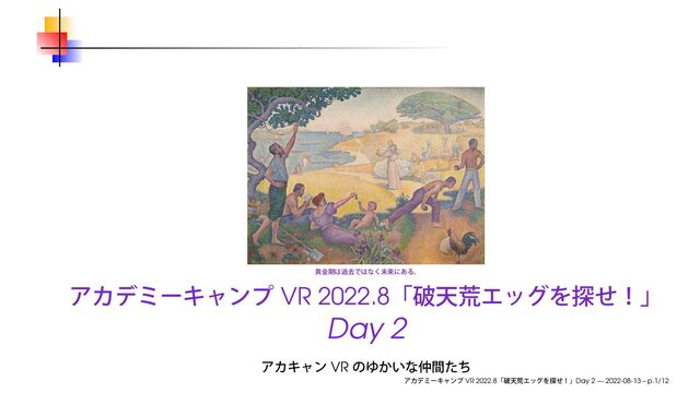 2022年8月13日に開催されたアカデミーキャンプ VR 2022.8「破天荒エッグを探せ!」Day 2 で用いたスライドです。