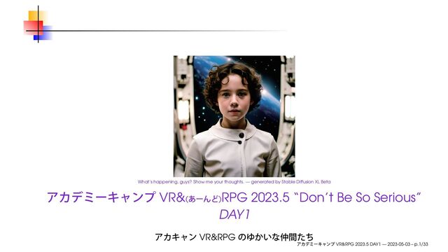 Stable Diffusion XL Beta VR&( )RPG 2023.5 “Don’t Be So Serious” DAY1 VR&RPG VR&RPG 2023.5 DAY1 — 2023-05-03 – p.1/33