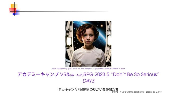 2023年5月5日(金)、物理 + オンラインで開催された、アカデミーキャンプ VR&(あーんど)RPG 2023.5 “Don’t Be So Serious” DAY 3 で使用したスライドです。
