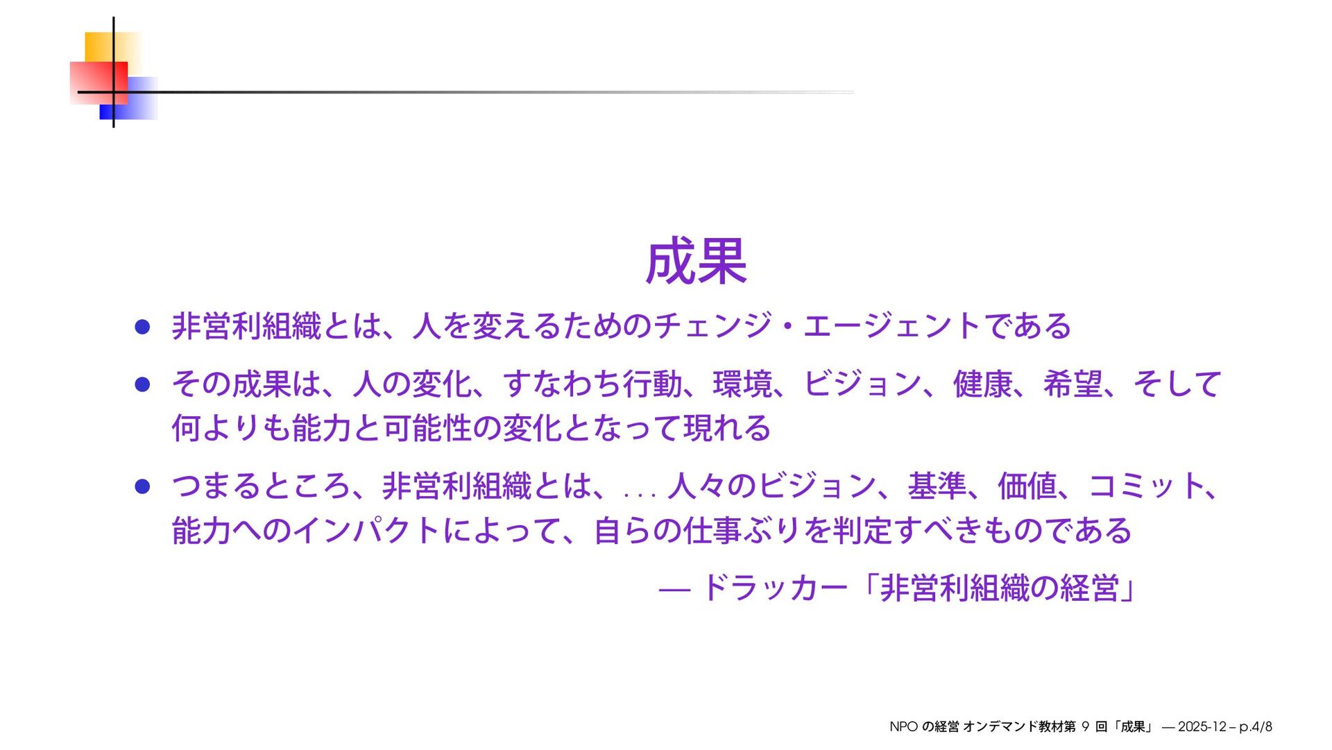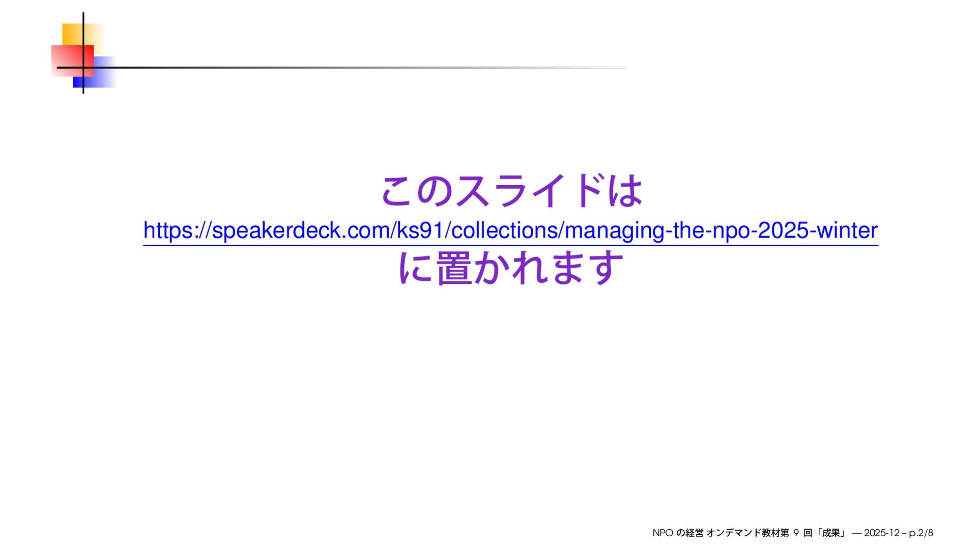 https://speakerdeck.com/ks91/collections/managing-the-npo-2025-winter NPO 9 — 2025-12 – p.2/8