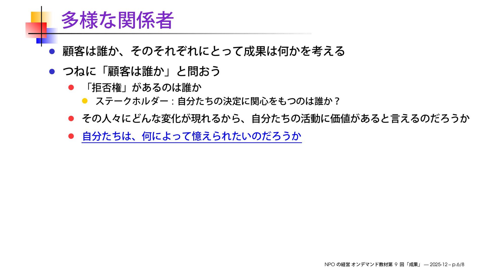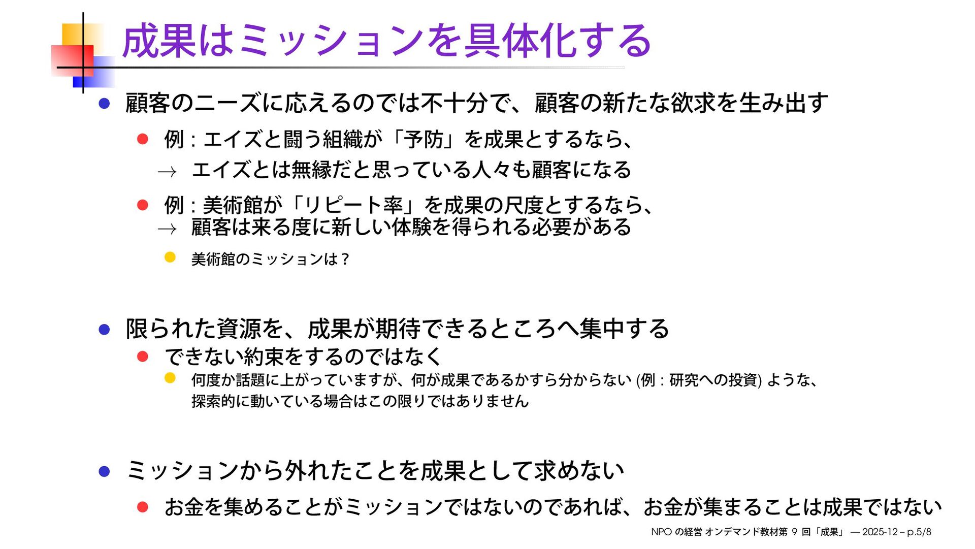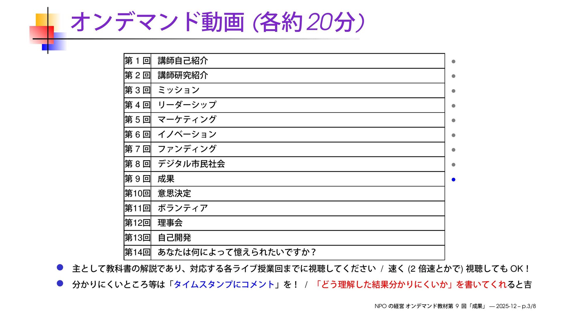 早稲田大学大学院経営管理研究科「NPOの経営」2025 冬のオンデマンド教材 第9回で使用したスライドです。