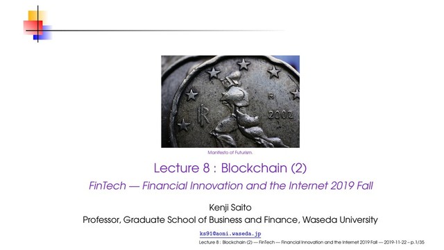 on or disguised as the thoughts and ideas of science and technology The world with existing science and technology is the real world Ex1 : Medical drama Ex2 : Economic novels The world with science and technology unknown to the real world → Fiction Ex1 : Medical drama with nano-machines Ex2 : Drama with digital currency that depreciates (my book “NEO in Wonderland”) Designing new media and putting it into society = living science fiction To work out plans for that = to write science fiction Lecture 8 : Blockchain (2) — FinTech — Financial Innovation and the Internet 2019 Fall — 2019-11-22 – p.32/35