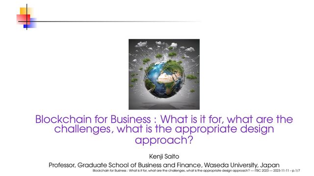the challenges, what is the appropriate design approach? Kenji Saito Professor, Graduate School of Business and Finance, Waseda University, Japan Blockchain for Business : What is it for, what are the challenges, what is the appropriate design approach? — ITBC 2023 — 2023-11-11 – p.1/7