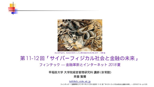 2018年7月16日(月)、早稲田大学 大学院経営管理研究科の授業「フィンテック ─ 金融革新とインターネット」第11-12回で使用したスライドです (第9-10回は休講です)。