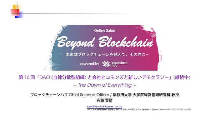 2021年12月13日(月)、オンラインサロン Beyond Blockchain 第16回「DAO (自律分散型組織) と会社とコモンズと新しいデモクラシー (継続中)」にて使用したスライドです。