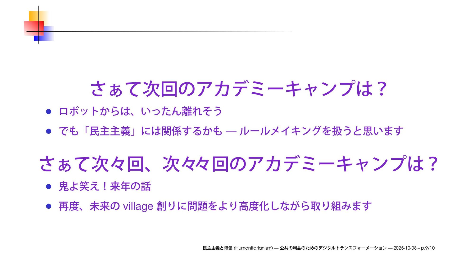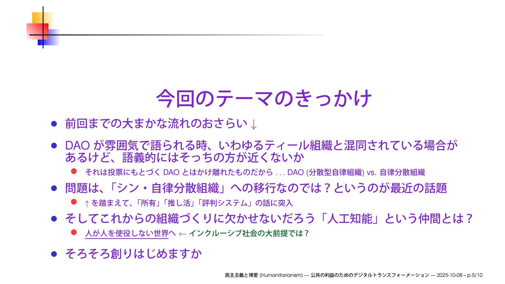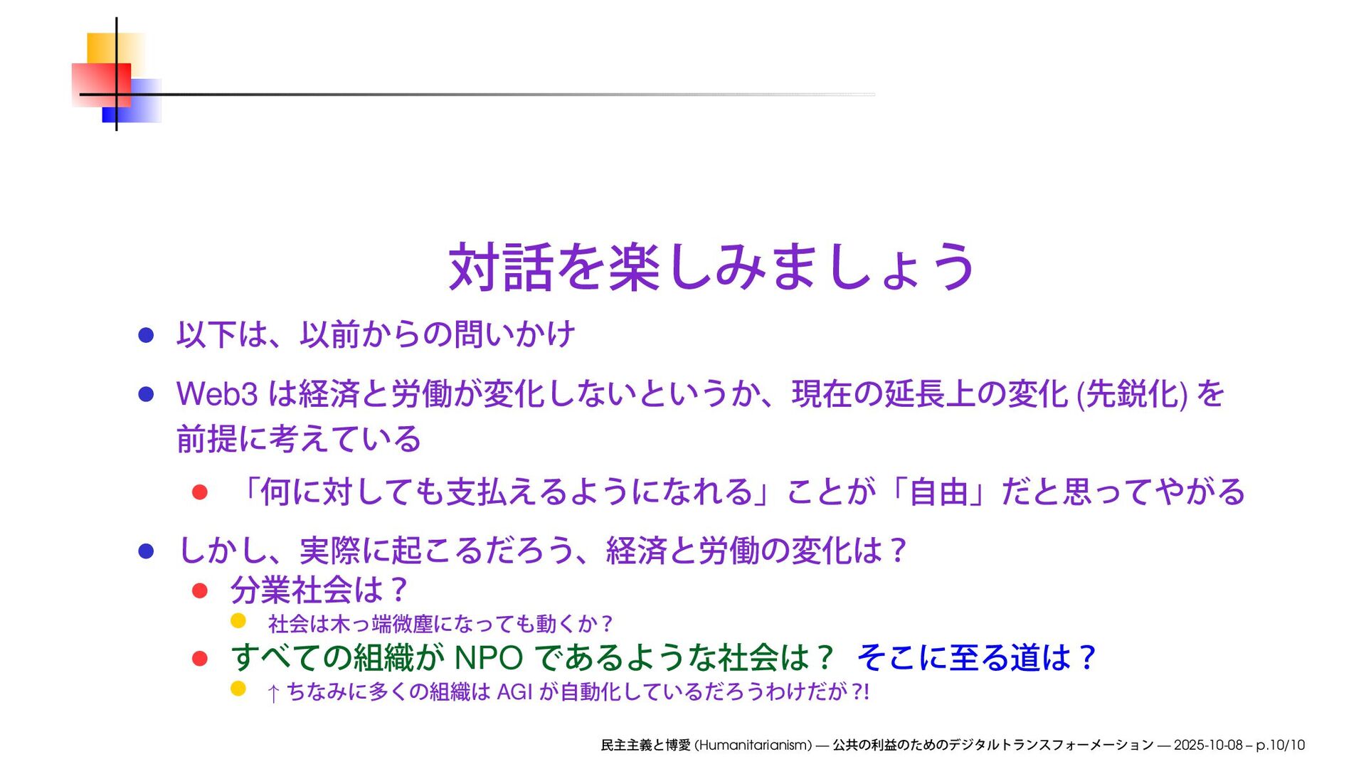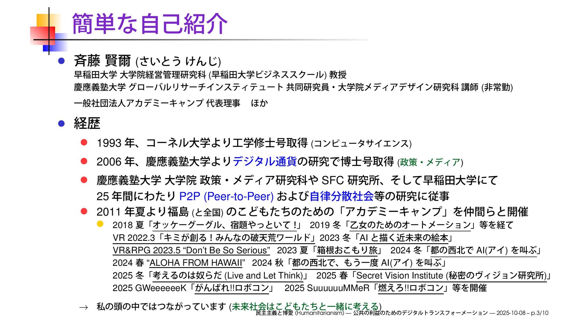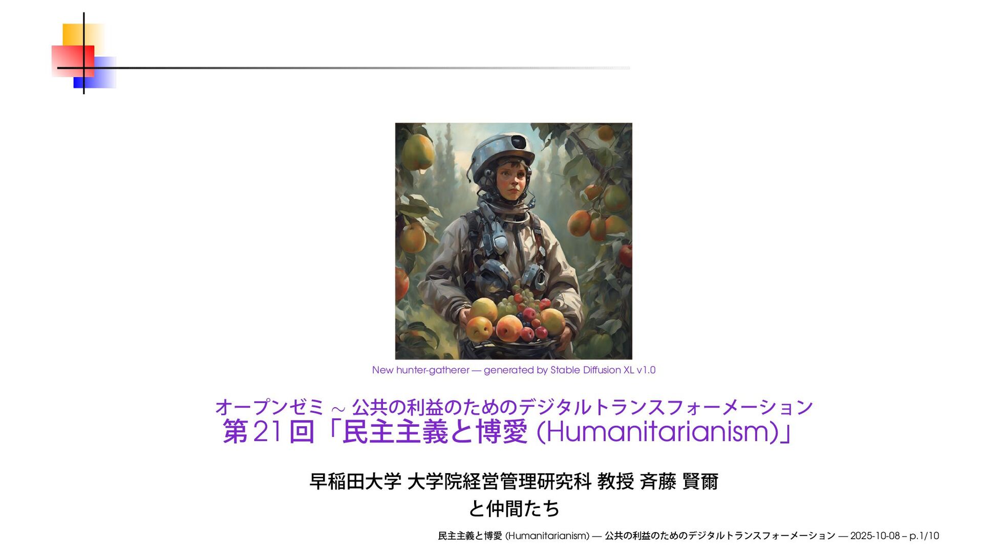 2025年10月8日(水)、オンラインで開催された、オープンゼミ 〜 公共の利益のためのデジタルトランスフォーメーション 第21回で使用したスライドです。