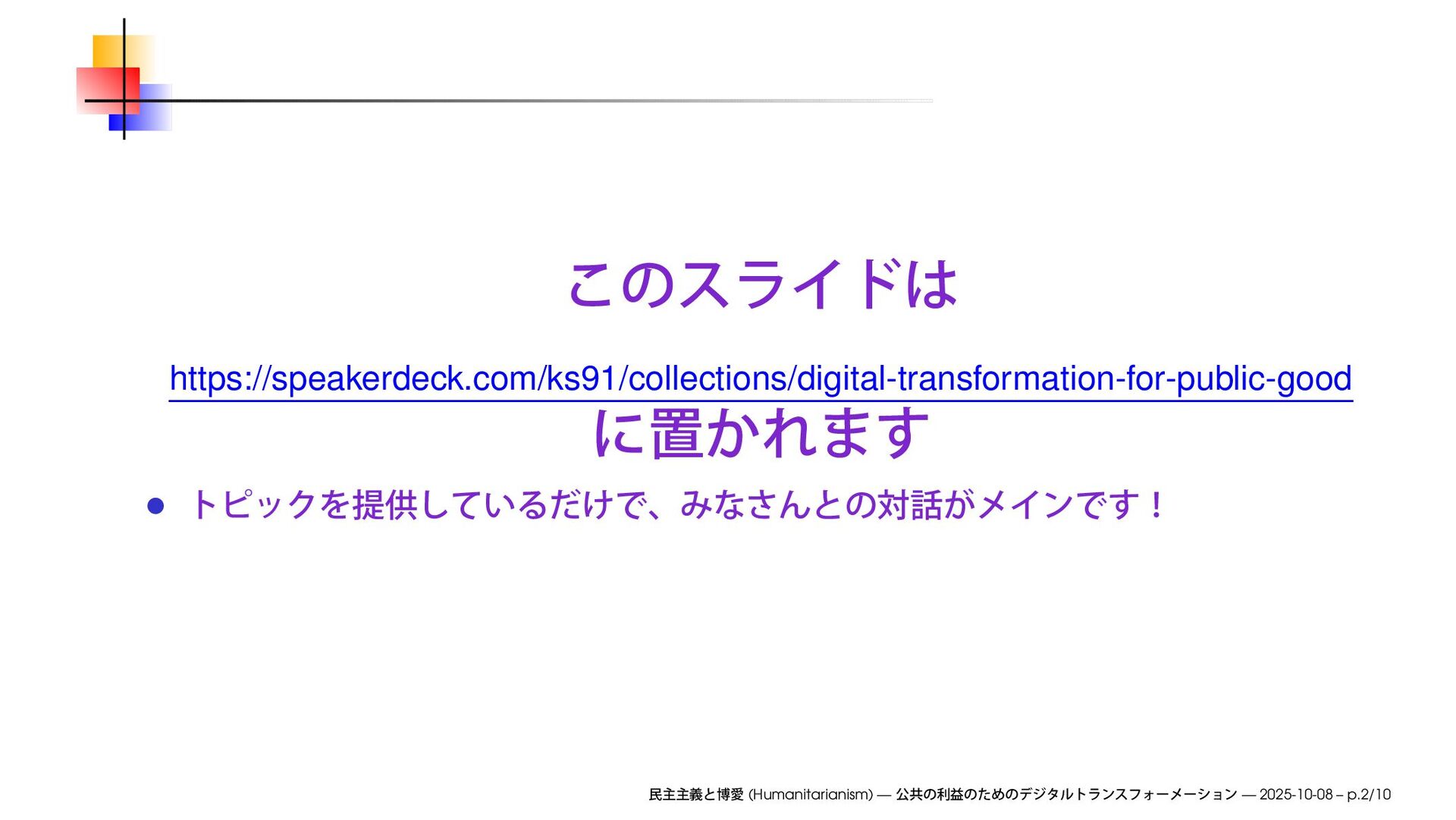 https://speakerdeck.com/ks91/collections/digital-transformation-for-public-good (Humanitarianism) — — 2025-10-08 – p.2/10