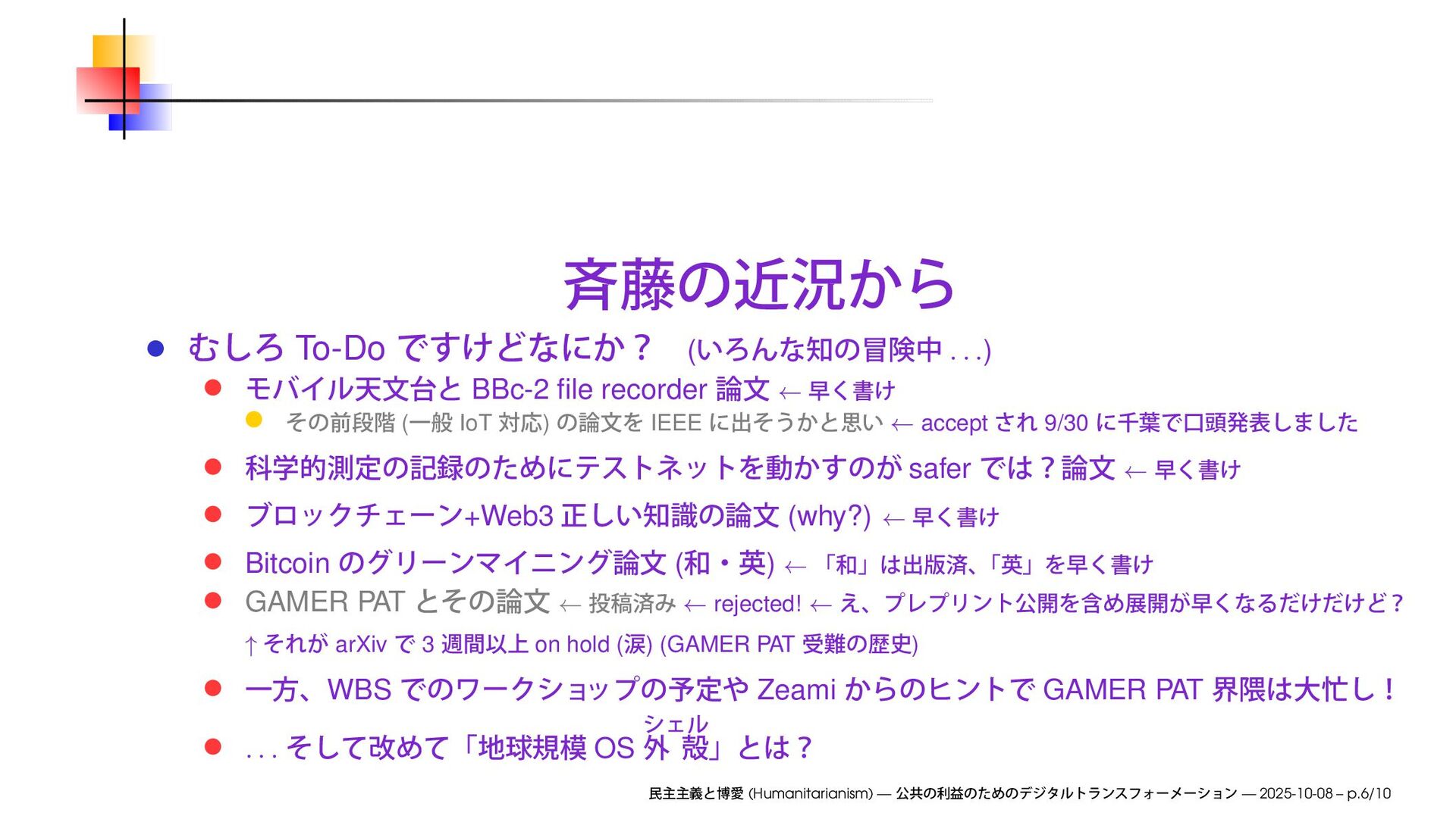 ( IoT ) IEEE ← accept 9/30 safer ← +Web3 (why?) ← Bitcoin ( ) ← GAMER PAT ← ← rejected! ← ↑ arXiv 3 on hold ( ) (GAMER PAT ) WBS Zeami GAMER PAT . . . OS (Humanitarianism) — — 2025-10-08 – p.6/10