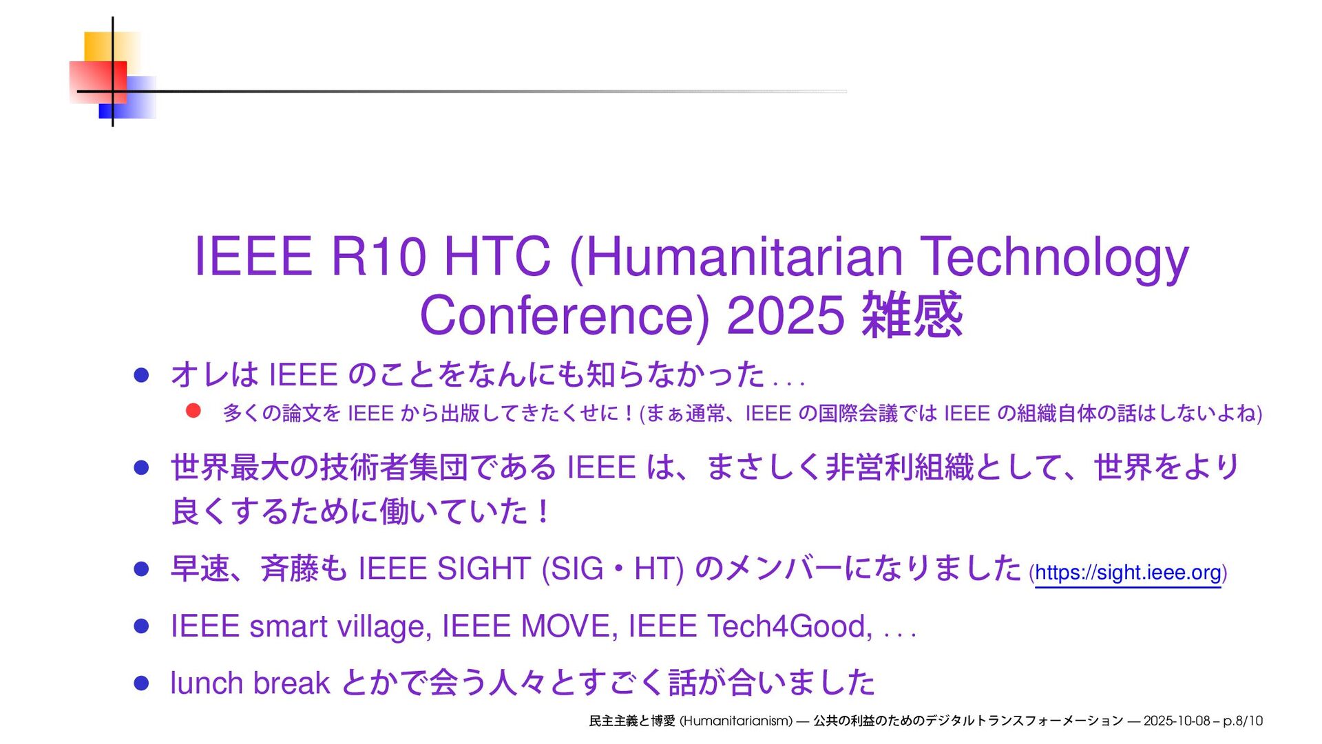 . IEEE ( IEEE IEEE ) IEEE IEEE SIGHT (SIG HT) (https://sight.ieee.org) IEEE smart village, IEEE MOVE, IEEE Tech4Good, . . . lunch break (Humanitarianism) — — 2025-10-08 – p.8/10