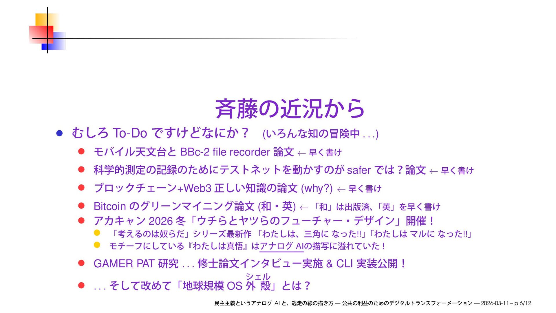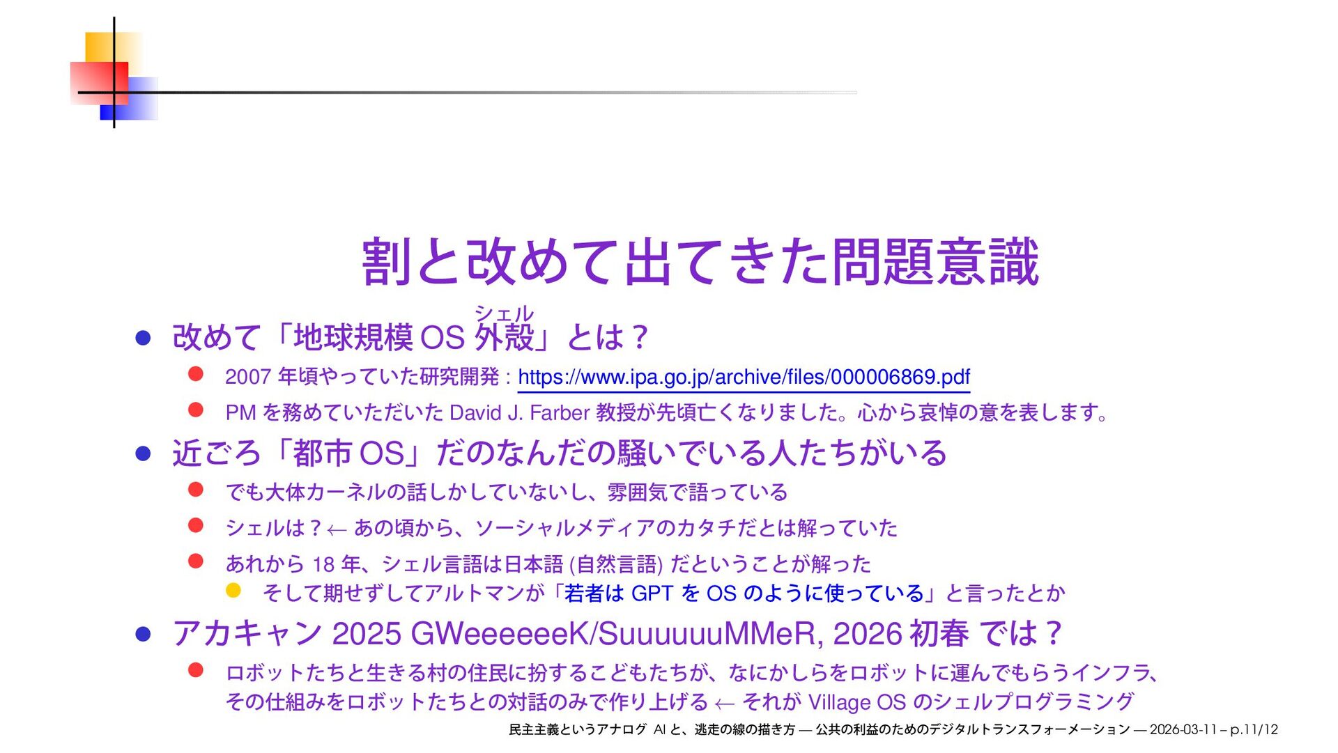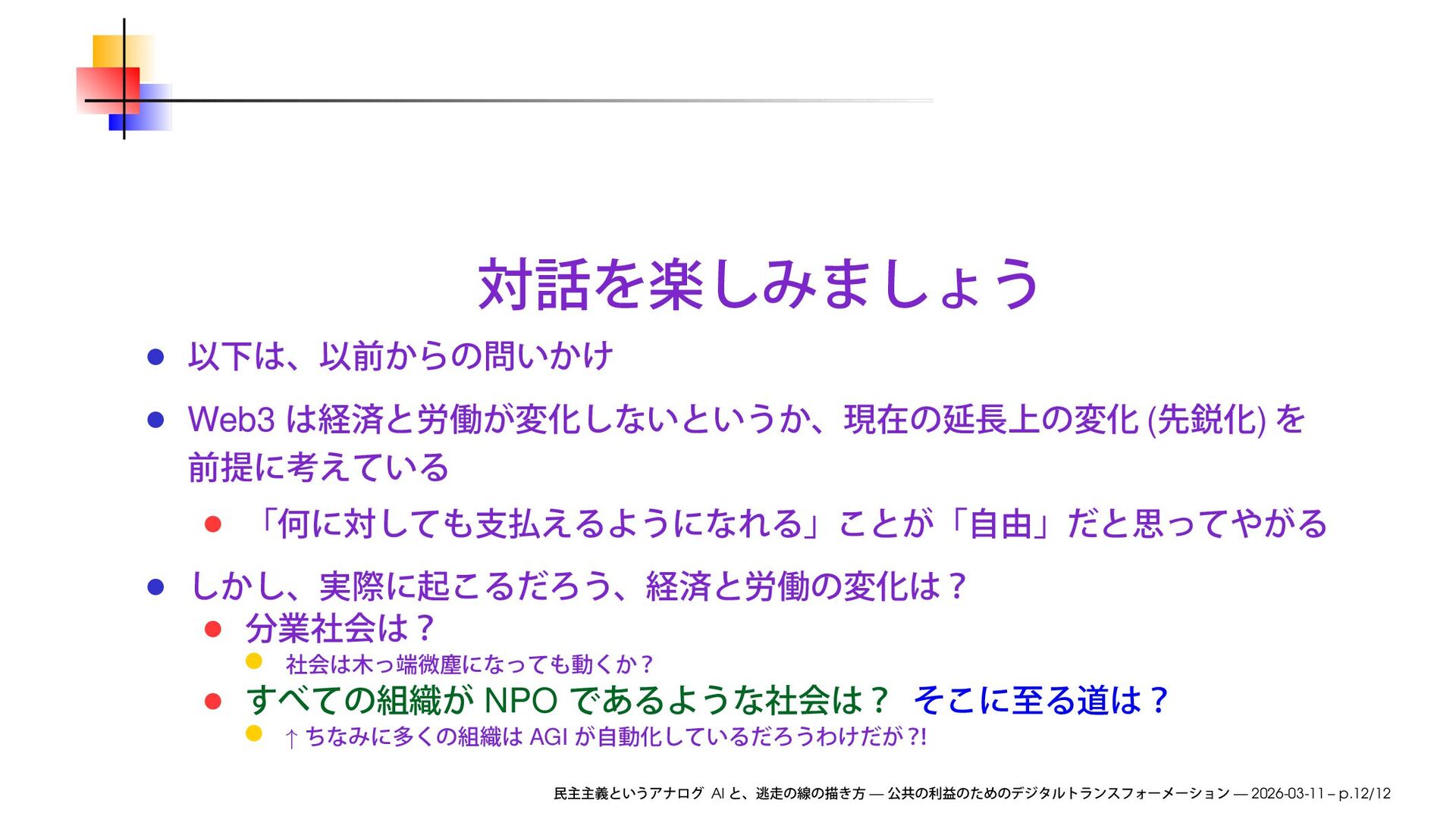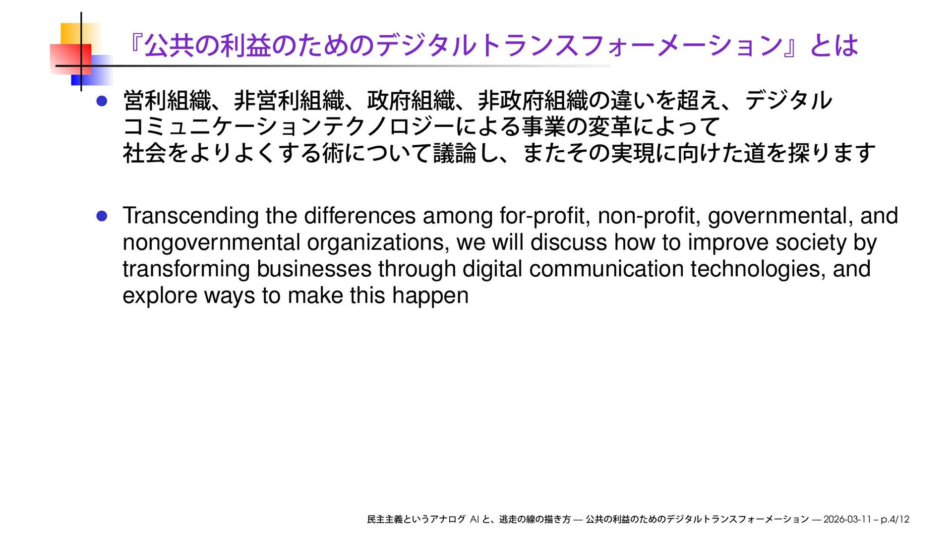 we will discuss how to improve society by transforming businesses through digital communication technologies, and explore ways to make this happen AI — — 2026-03-11 – p.4/12