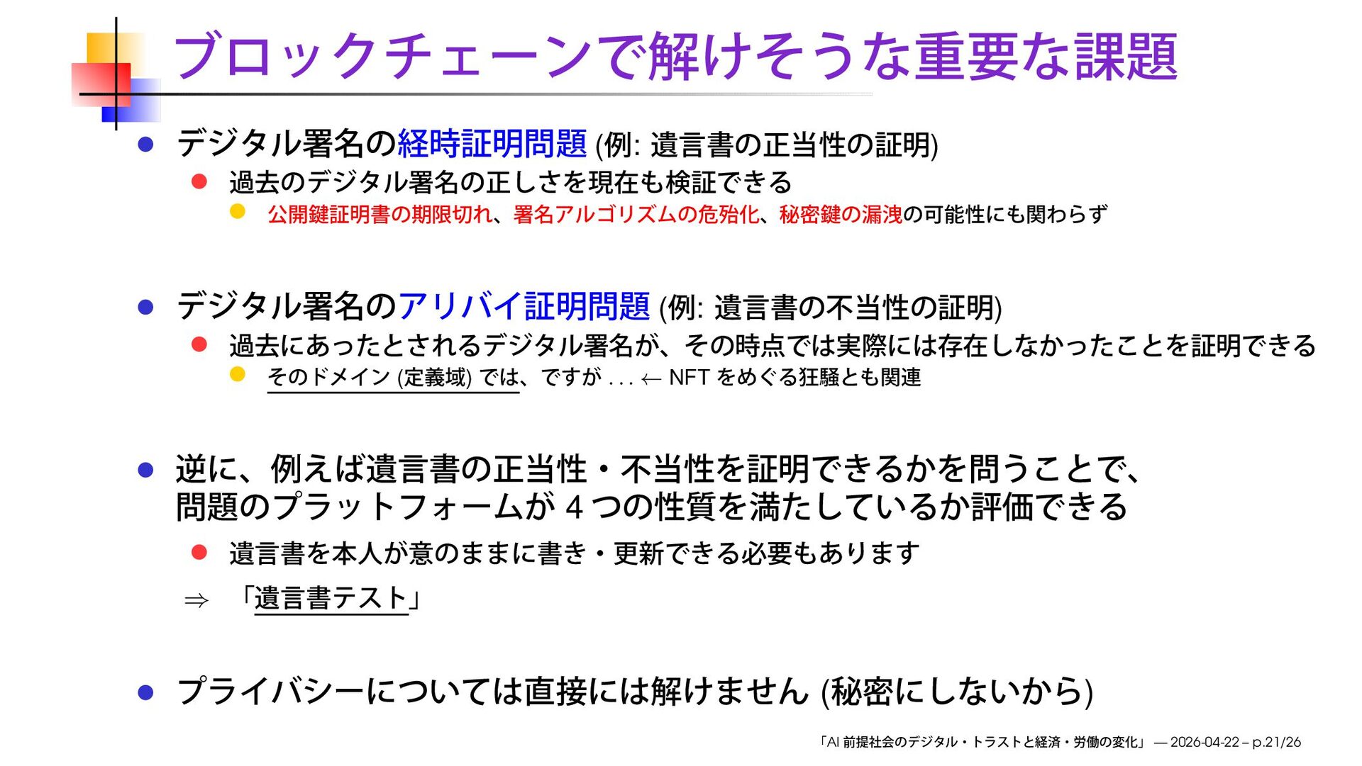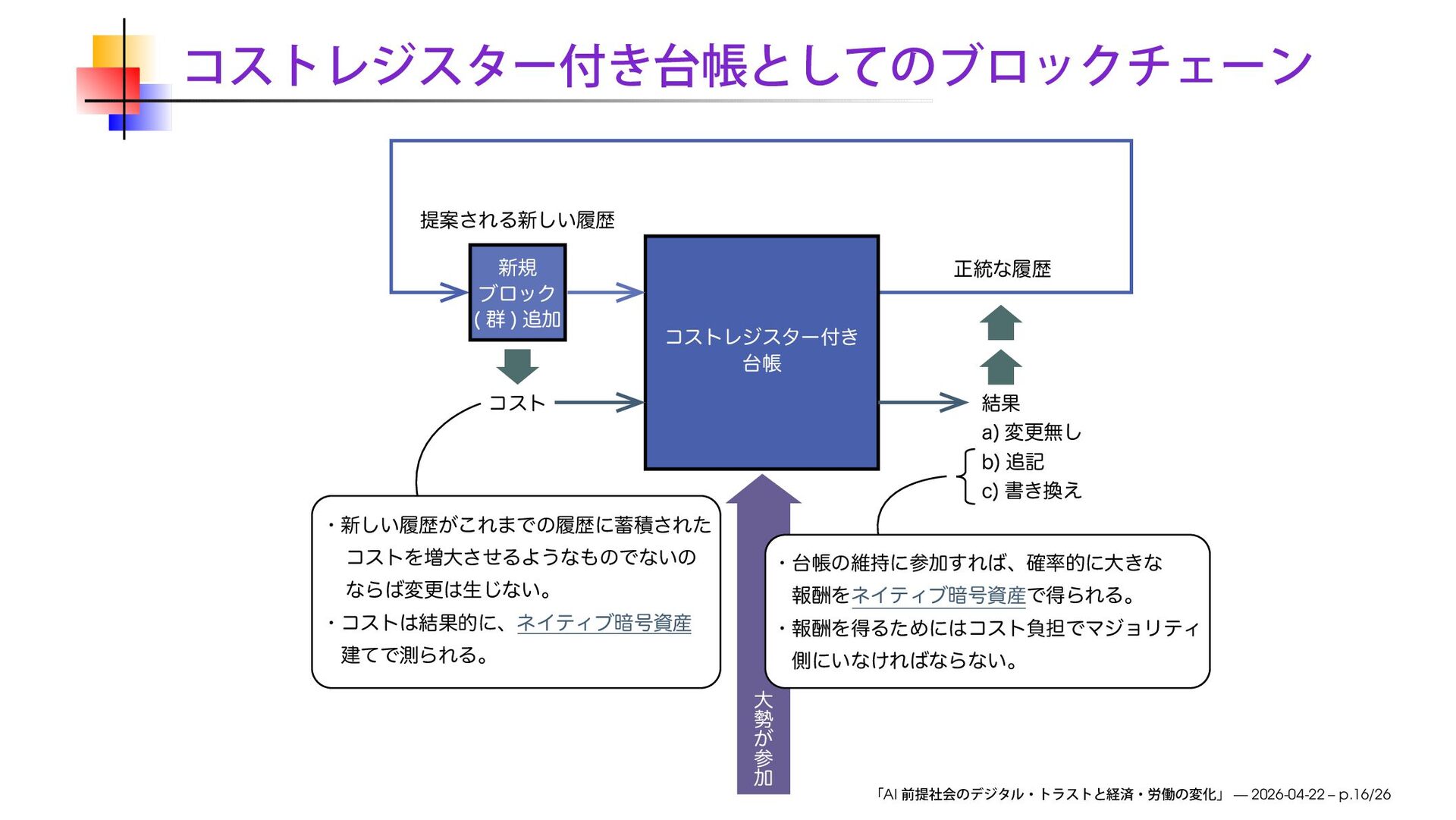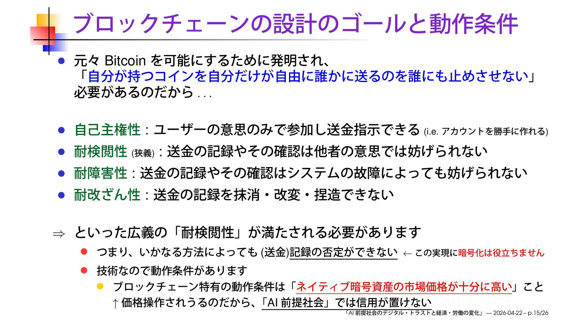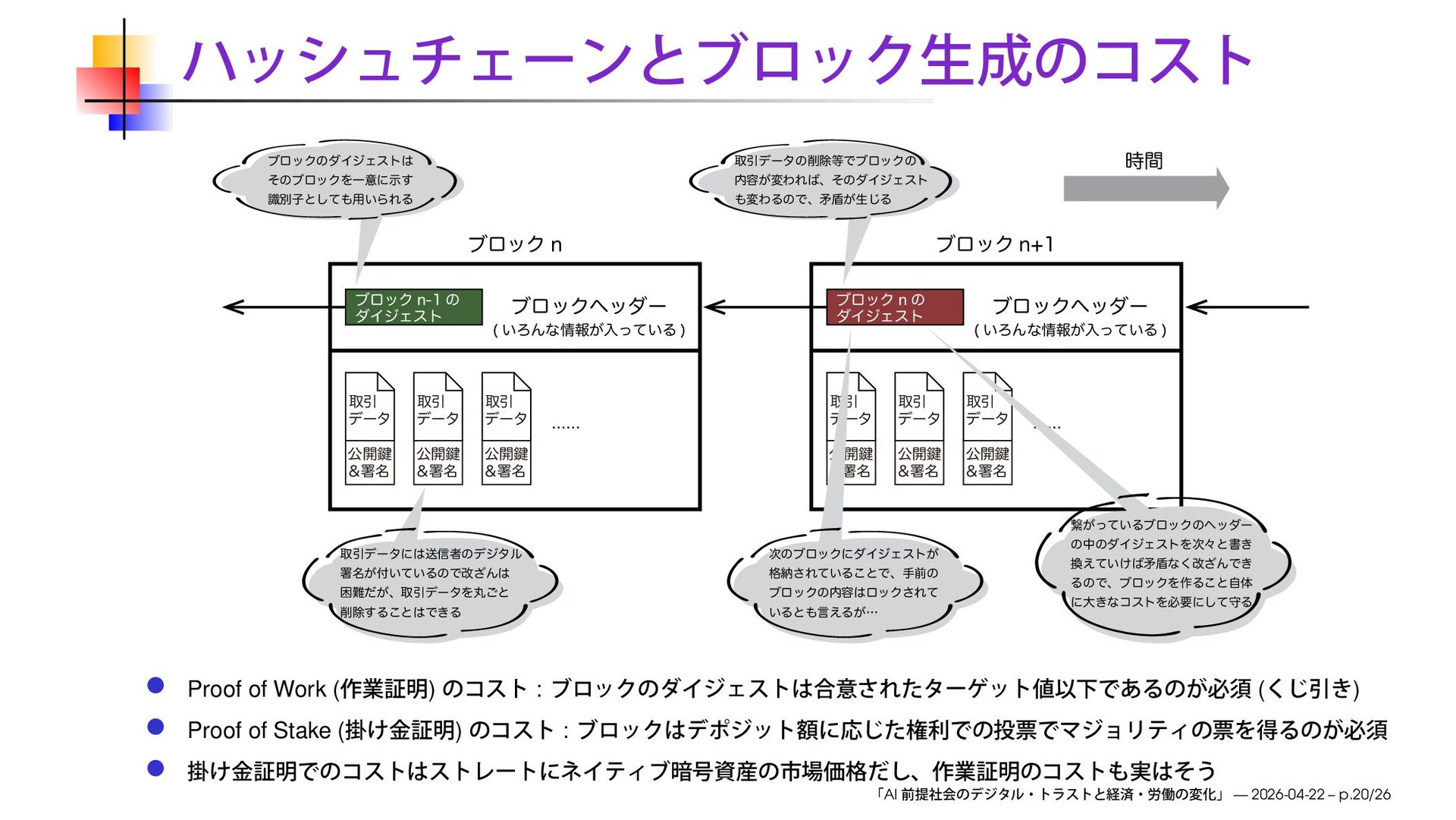 σʔλ ެ։伴 ˍॺ໊ औҾ σʔλ ެ։伴 ˍॺ໊ औҾ σʔλ ެ։伴 ˍॺ໊ ʜʜ ϒϩοΫ O ϒϩοΫϔομʔ ͍ΖΜͳใ͕ೖ͍ͬͯΔ ϒϩοΫ O ͷ μΠδΣετ औҾ σʔλ ެ։伴 ˍॺ໊ औҾ σʔλ ެ։伴 ˍॺ໊ औҾ σʔλ ެ։伴 ˍॺ໊ ʜʜ ϒϩοΫͷμΠδΣετ ͦͷϒϩοΫΛҰҙʹࣔ͢ ࣝผࢠͱͯ͠༻͍ΒΕΔ औҾσʔλͷআͰϒϩοΫͷ ༰͕มΘΕɺͦͷμΠδΣετ มΘΔͷͰɺໃ६͕ੜ͡Δ औҾσʔλʹૹ৴ऀͷσδλϧ ॺ໊͕͍͍ͯΔͷͰվ͟Μ ࠔ͕ͩɺऔҾσʔλΛؙ͝ͱ আ͢Δ͜ͱͰ͖Δ ࣍ͷϒϩοΫʹμΠδΣετ͕ ֨ೲ͞Ε͍ͯΔ͜ͱͰɺखલͷ ϒϩοΫͷ༰ϩοΫ͞Εͯ ͍Δͱݴ͑Δ͕ʜ ܨ͕͍ͬͯΔϒϩοΫͷϔομʔ ͷதͷμΠδΣετΛ࣍ʑͱॻ͖ ͍͚͑ͯໃ६ͳ͘վ͟ΜͰ͖ ΔͷͰɺϒϩοΫΛ࡞Δ͜ͱࣗମ ʹେ͖ͳίετΛඞཁʹͯ͠कΔ Proof of Work ( ) : ( ) Proof of Stake ( ) : AI — 2026-04-22 – p.20/26