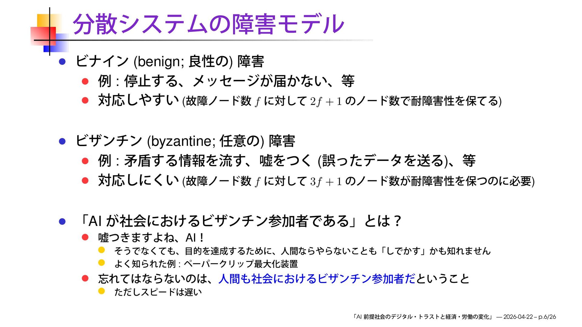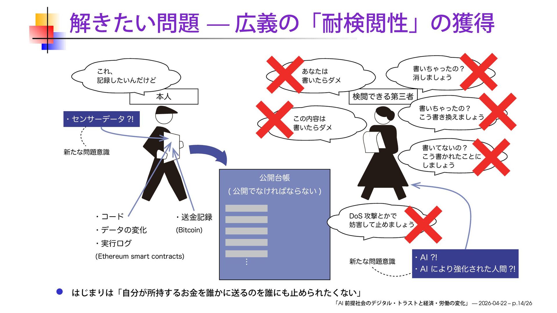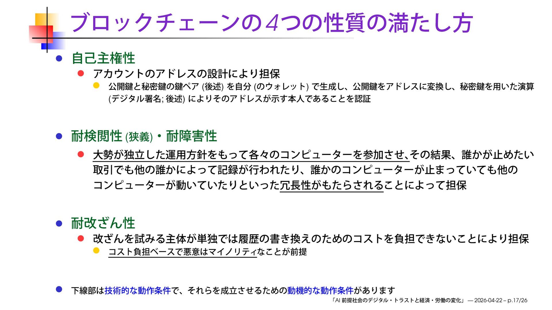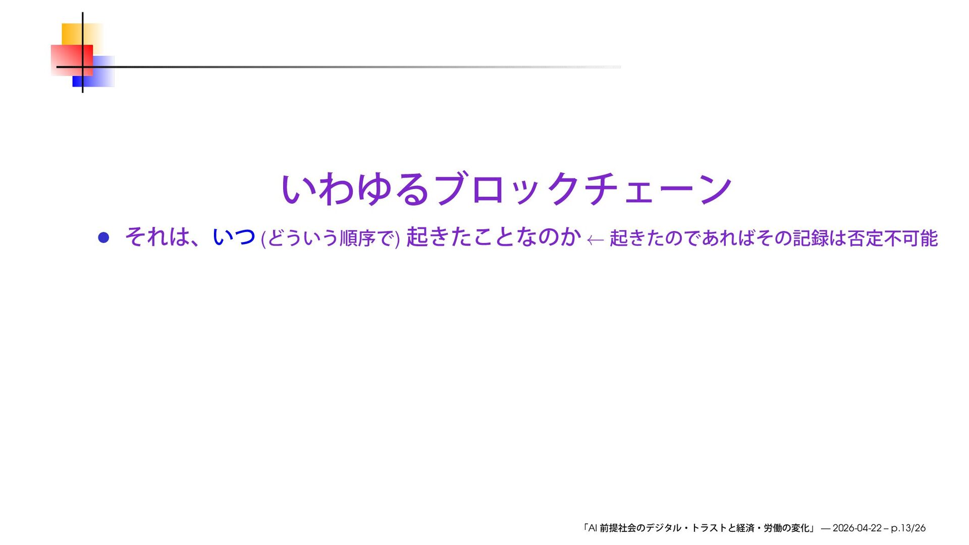 σʔλ ެ։伴 ˍॺ໊ औҾ σʔλ ެ։伴 ˍॺ໊ औҾ σʔλ ެ։伴 ˍॺ໊ ʜʜ ϒϩοΫ O ϒϩοΫϔομʔ ͍ΖΜͳใ͕ೖ͍ͬͯΔ ϒϩοΫ O ͷ μΠδΣετ औҾ σʔλ ެ։伴 ˍॺ໊ औҾ σʔλ ެ։伴 ˍॺ໊ औҾ σʔλ ެ։伴 ˍॺ໊ ʜʜ ϒϩοΫͷμΠδΣετ ͦͷϒϩοΫΛҰҙʹࣔ͢ ࣝผࢠͱͯ͠༻͍ΒΕΔ औҾσʔλͷআͰϒϩοΫͷ ༰͕มΘΕɺͦͷμΠδΣετ มΘΔͷͰɺໃ६͕ੜ͡Δ औҾσʔλʹૹ৴ऀͷσδλϧ ॺ໊͕͍͍ͯΔͷͰվ͟Μ ࠔ͕ͩɺऔҾσʔλΛؙ͝ͱ আ͢Δ͜ͱͰ͖Δ ࣍ͷϒϩοΫʹμΠδΣετ͕ ֨ೲ͞Ε͍ͯΔ͜ͱͰɺखલͷ ϒϩοΫͷ༰ϩοΫ͞Εͯ ͍Δͱݴ͑Δ͕ʜ ܨ͕͍ͬͯΔϒϩοΫͷϔομʔ ͷதͷμΠδΣετΛ࣍ʑͱॻ͖ ͍͚͑ͯໃ६ͳ͘վ͟ΜͰ͖ ΔͷͰɺϒϩοΫΛ࡞Δ͜ͱࣗମ ʹେ͖ͳίετΛඞཁʹͯ͠कΔ Proof of Work ( ) : ( ) Proof of Stake ( ) : AI — 2026-04-22 – p.20/26