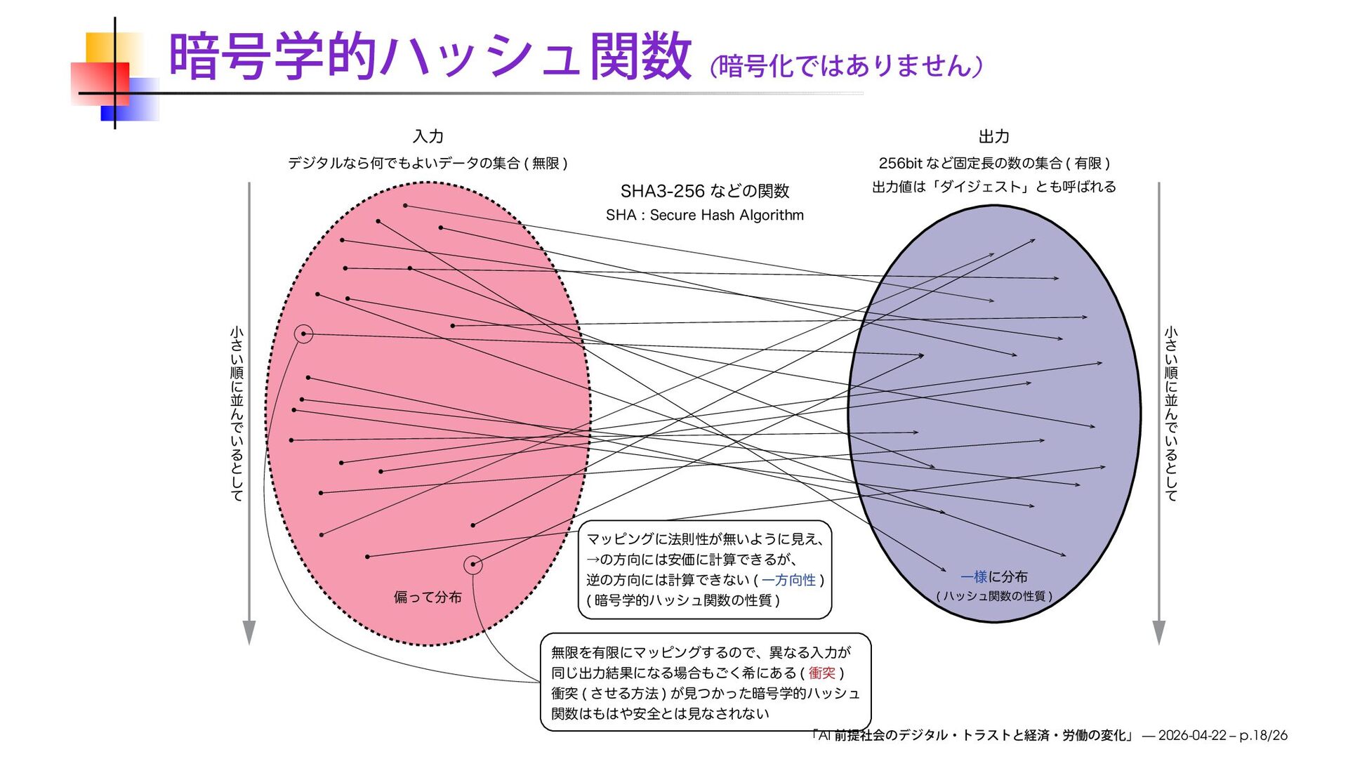 খ ͞ ͍ ॱ ʹ ฒ Μ Ͱ ͍ Δ ͱ ͠ ͯ খ ͞ ͍ ॱ ʹ ฒ Μ Ͱ ͍ Δ ͱ ͠ ͯ 4)"ͳͲͷؔ 4)"4FDVSF)BTI"MHPSJUIN Ұ༷ʹ ϋογϡؔͷੑ࣭ ภͬͯ Ϛοϐϯάʹ๏ଇੑ͕ແ͍Α͏ʹݟ͑ɺ ˠͷํʹ҆ՁʹܭࢉͰ͖Δ͕ɺ ٯͷํʹܭࢉͰ͖ͳ͍ Ұํੑ ҉߸ֶతϋογϡؔͷੑ࣭ ແݶΛ༗ݶʹϚοϐϯά͢ΔͷͰɺҟͳΔೖྗ͕ ಉ͡ग़ྗ݁ՌʹͳΔ߹͘͝رʹ͋Δ িಥ িಥ ͤ͞Δํ๏ ͕ݟ͔ͭͬͨ҉߸ֶతϋογϡ ؔ҆શͱݟͳ͞Εͳ͍ AI — 2026-04-22 – p.18/26