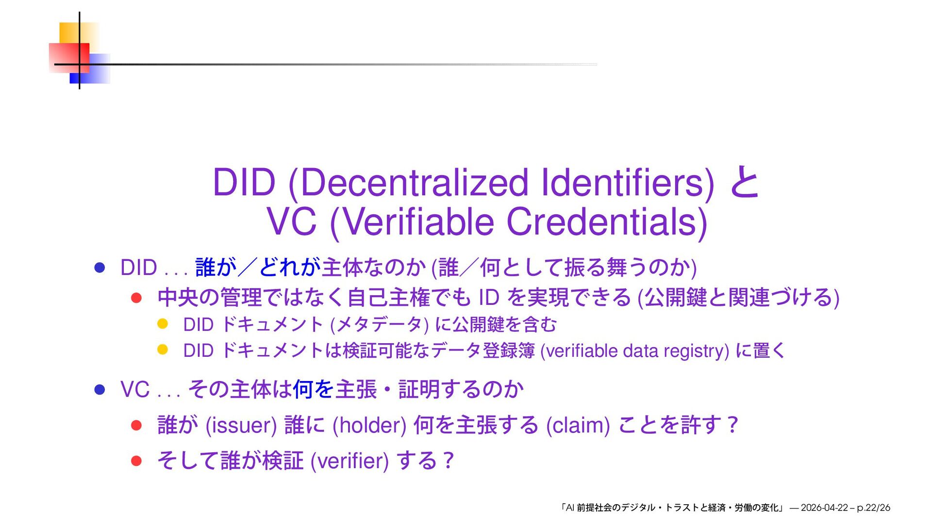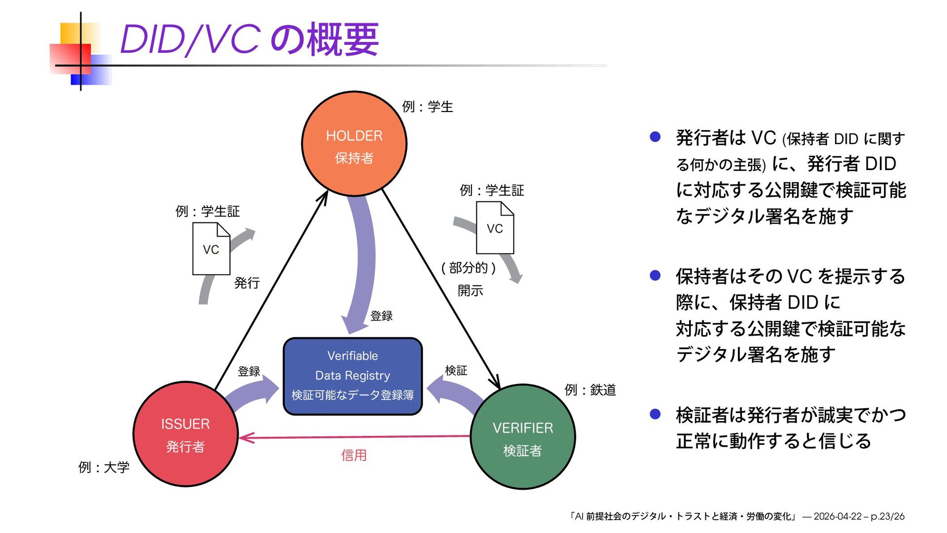 ( ) ID ( ) DID ( ) DID (verifiable data registry) VC . . . (issuer) (holder) (claim) (verifier) AI — 2026-04-22 – p.22/26