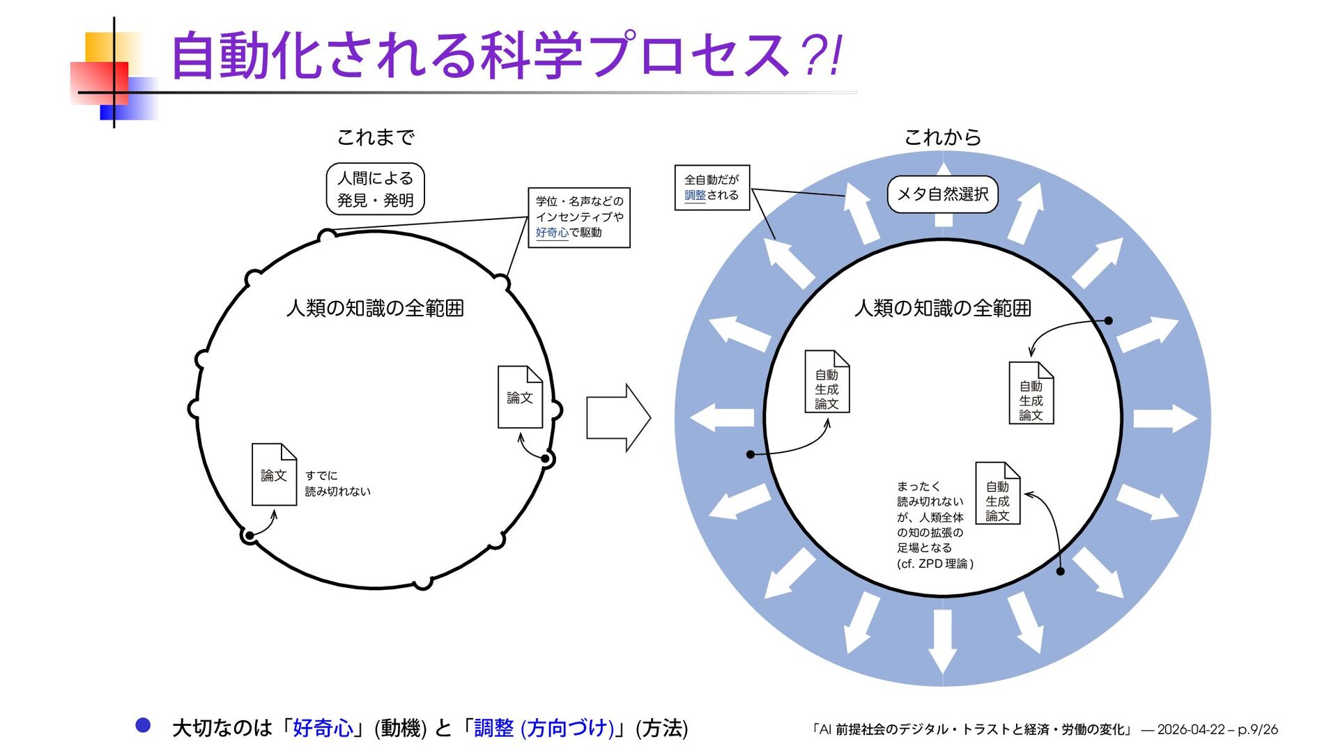 ੜ จ ࣗಈ ੜ จ ࣗಈ ੜ จ ͢Ͱʹ ಡΈΕͳ͍ ֶҐɾ໊ͳͲͷ ΠϯηϯςΟϒ ح৺Ͱۦಈ શࣗಈ͕ͩ ௐ͞ΕΔ ·ͬͨ͘ ಡΈΕͳ͍ ͕ɺਓྨશମ ͷͷ֦ுͷ ͱͳΔ DG;1% ཧ ϝλࣗવબ ( ) ( ) ( ) AI — 2026-04-22 – p.9/26