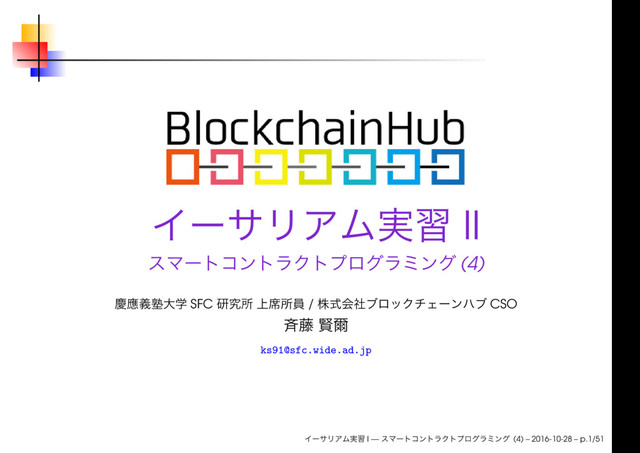 ブロックチェーンハブ主催で開催しているブロックチェーン連続講義シリーズ「スマートコントラクトプログラミング」の第4回「イーサリアム実習 II」のスライドです。2016年10月28日(金) に使用しました。