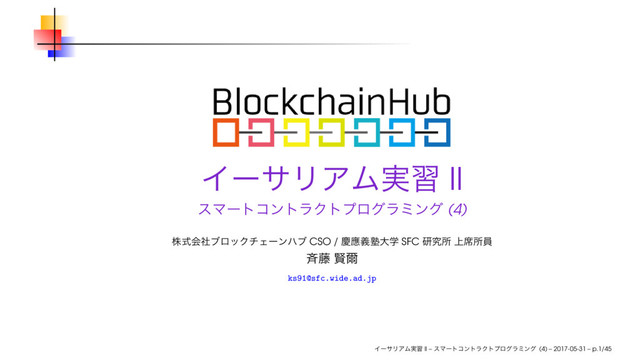ブロックチェーンハブ主催で開催している (第2期) スマートコントラクトプログラミング講義 (4) 「イーサリアム実習 II」のスライドです。2017年5月31日(水) に使用しました。