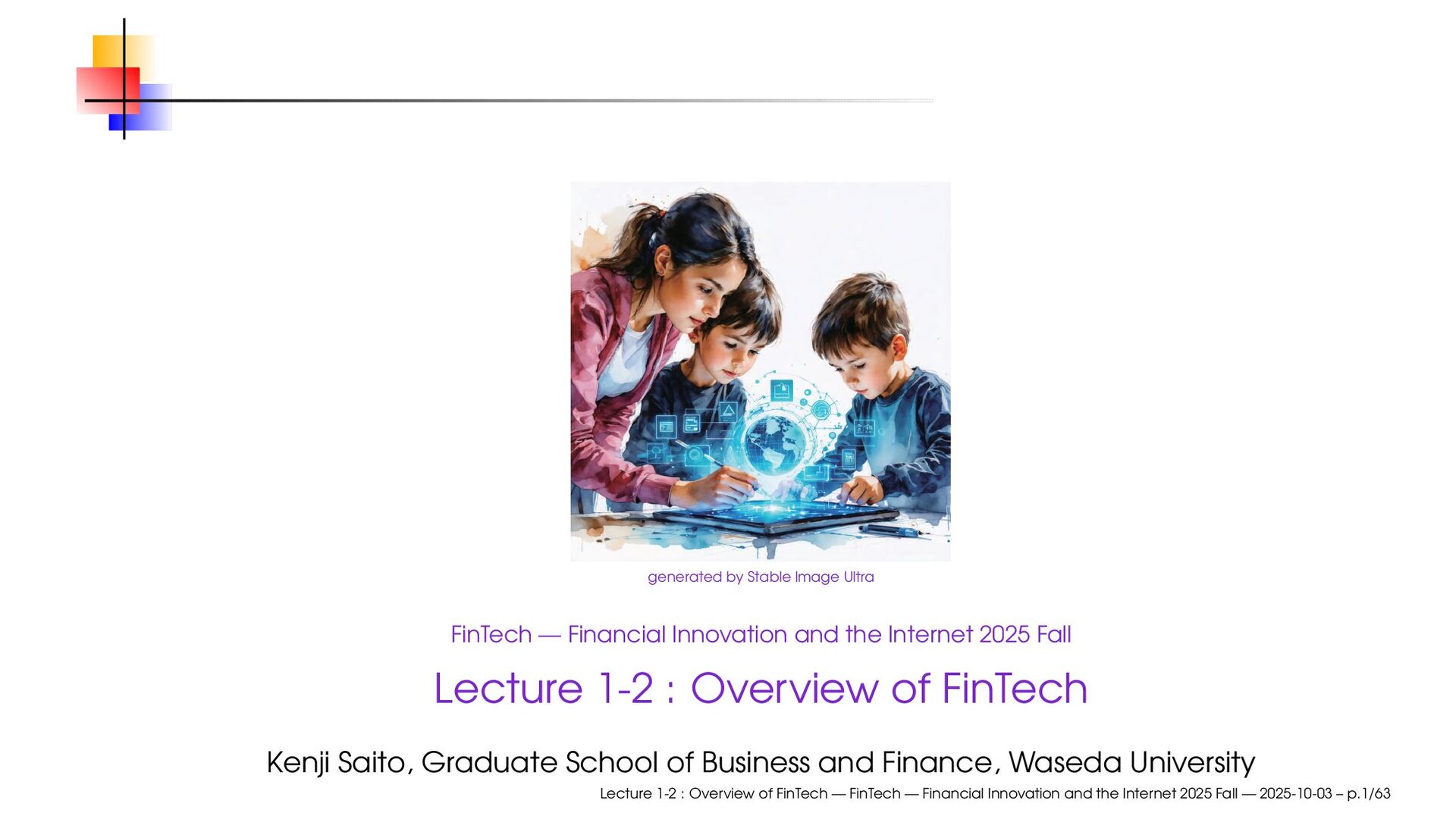 the Internet 2025 Fall Lecture 1-2 : Overview of FinTech Kenji Saito, Graduate School of Business and Finance, Waseda University Lecture 1-2 : Overview of FinTech — FinTech — Financial Innovation and the Internet 2025 Fall — 2025-10-03 – p.1/63