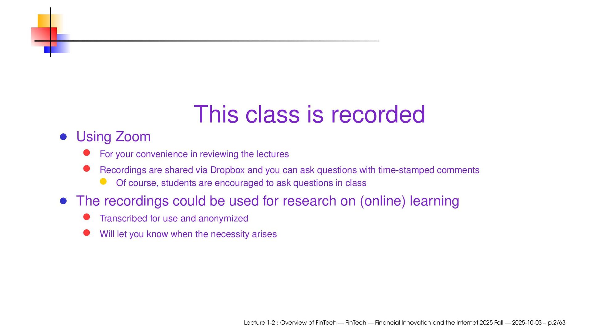 reviewing the lectures Recordings are shared via Dropbox and you can ask questions with time-stamped comments Of course, students are encouraged to ask questions in class The recordings could be used for research on (online) learning Transcribed for use and anonymized Will let you know when the necessity arises Lecture 1-2 : Overview of FinTech — FinTech — Financial Innovation and the Internet 2025 Fall — 2025-10-03 – p.2/63