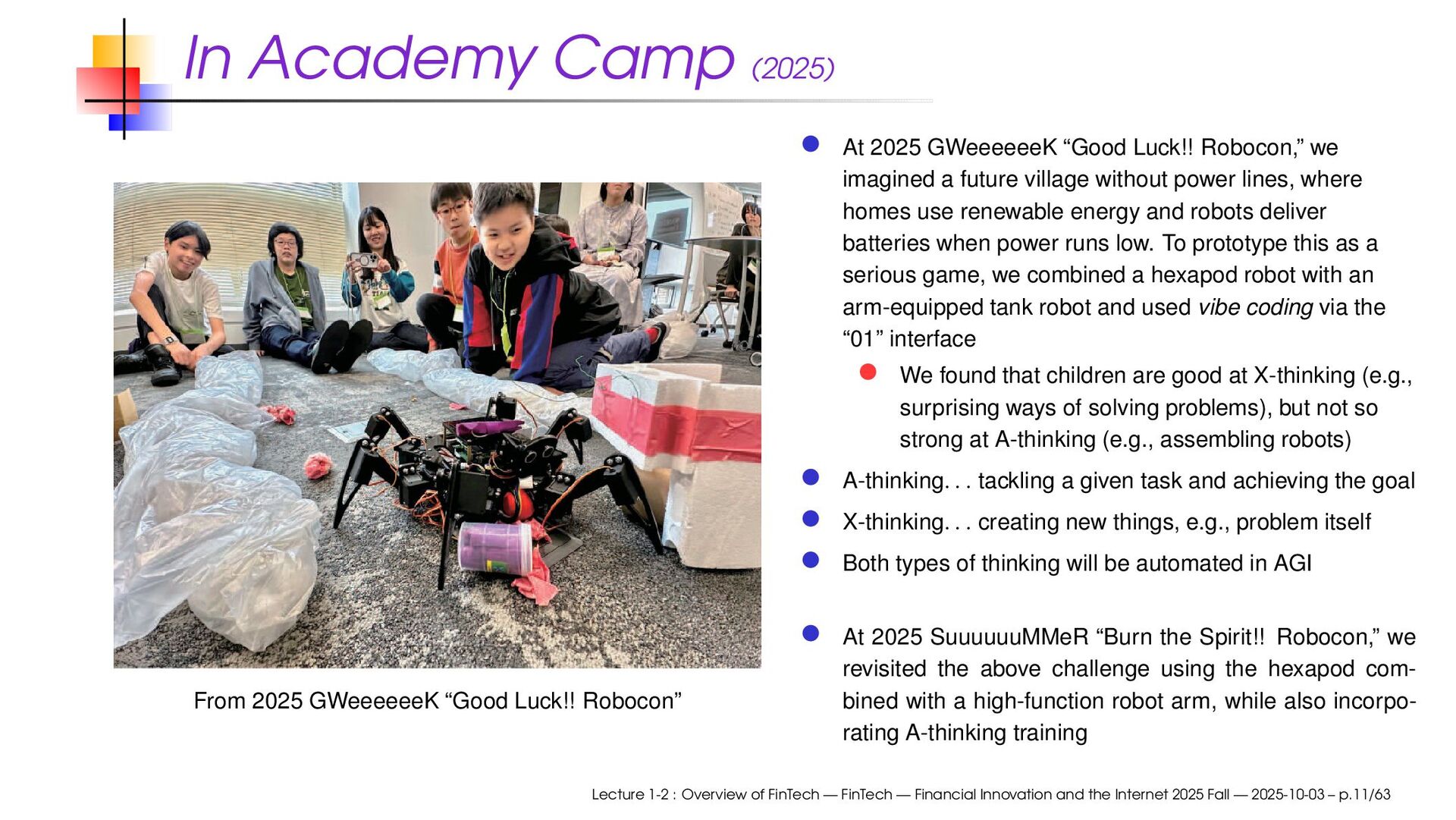 At 2025 GWeeeeeeK “Good Luck!! Robocon,” we imagined a future village without power lines, where homes use renewable energy and robots deliver batteries when power runs low. To prototype this as a serious game, we combined a hexapod robot with an arm-equipped tank robot and used vibe coding via the “01” interface We found that children are good at X-thinking (e.g., surprising ways of solving problems), but not so strong at A-thinking (e.g., assembling robots) A-thinking. . . tackling a given task and achieving the goal X-thinking. . . creating new things, e.g., problem itself Both types of thinking will be automated in AGI At 2025 SuuuuuuMMeR “Burn the Spirit!! Robocon,” we revisited the above challenge using the hexapod com- bined with a high-function robot arm, while also incorpo- rating A-thinking training Lecture 1-2 : Overview of FinTech — FinTech — Financial Innovation and the Internet 2025 Fall — 2025-10-03 – p.11/63