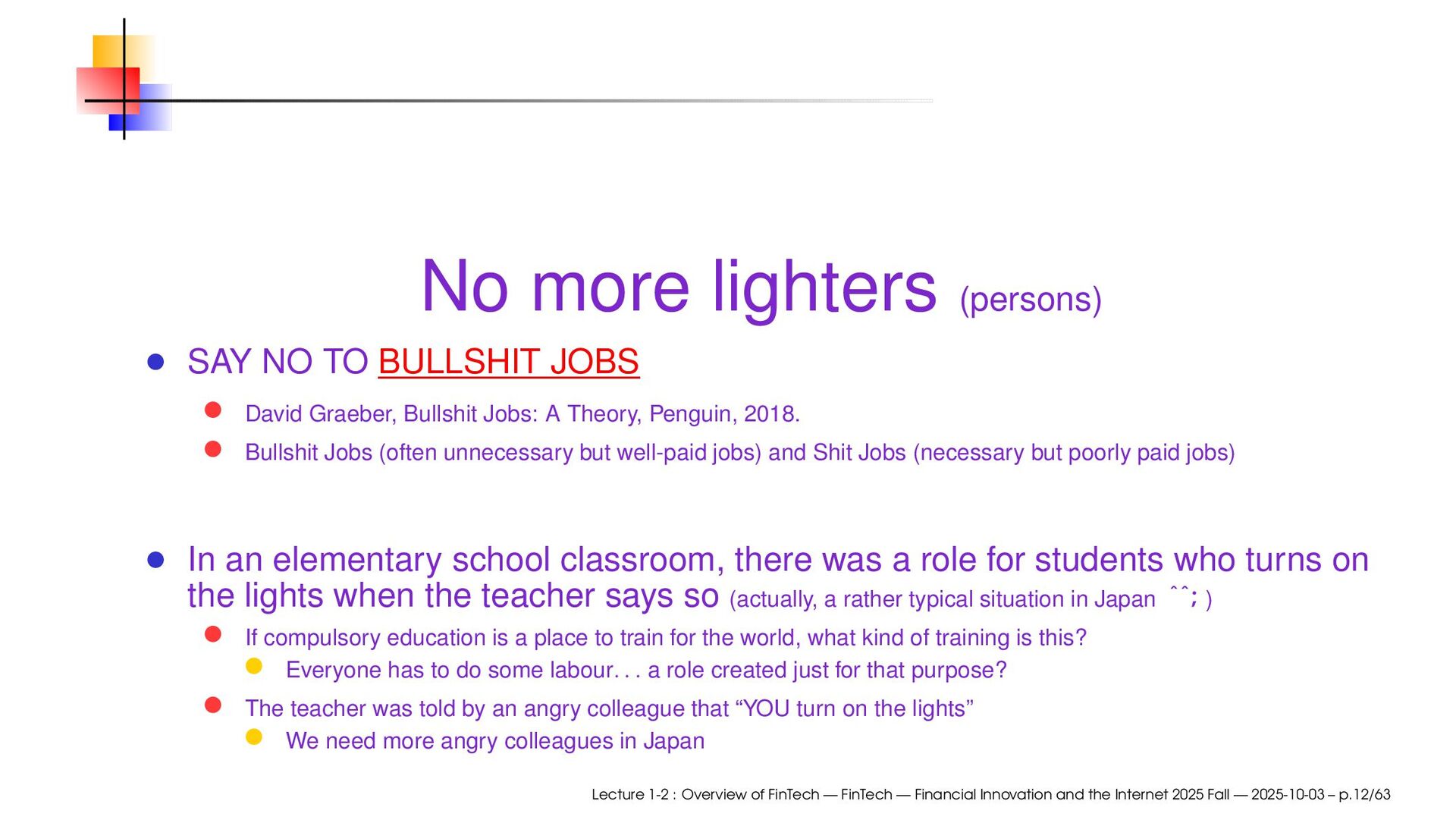 Graeber, Bullshit Jobs: A Theory, Penguin, 2018. Bullshit Jobs (often unnecessary but well-paid jobs) and Shit Jobs (necessary but poorly paid jobs) In an elementary school classroom, there was a role for students who turns on the lights when the teacher says so (actually, a rather typical situation in Japan ) If compulsory education is a place to train for the world, what kind of training is this? Everyone has to do some labour. . . a role created just for that purpose? The teacher was told by an angry colleague that “YOU turn on the lights” We need more angry colleagues in Japan Lecture 1-2 : Overview of FinTech — FinTech — Financial Innovation and the Internet 2025 Fall — 2025-10-03 – p.12/63