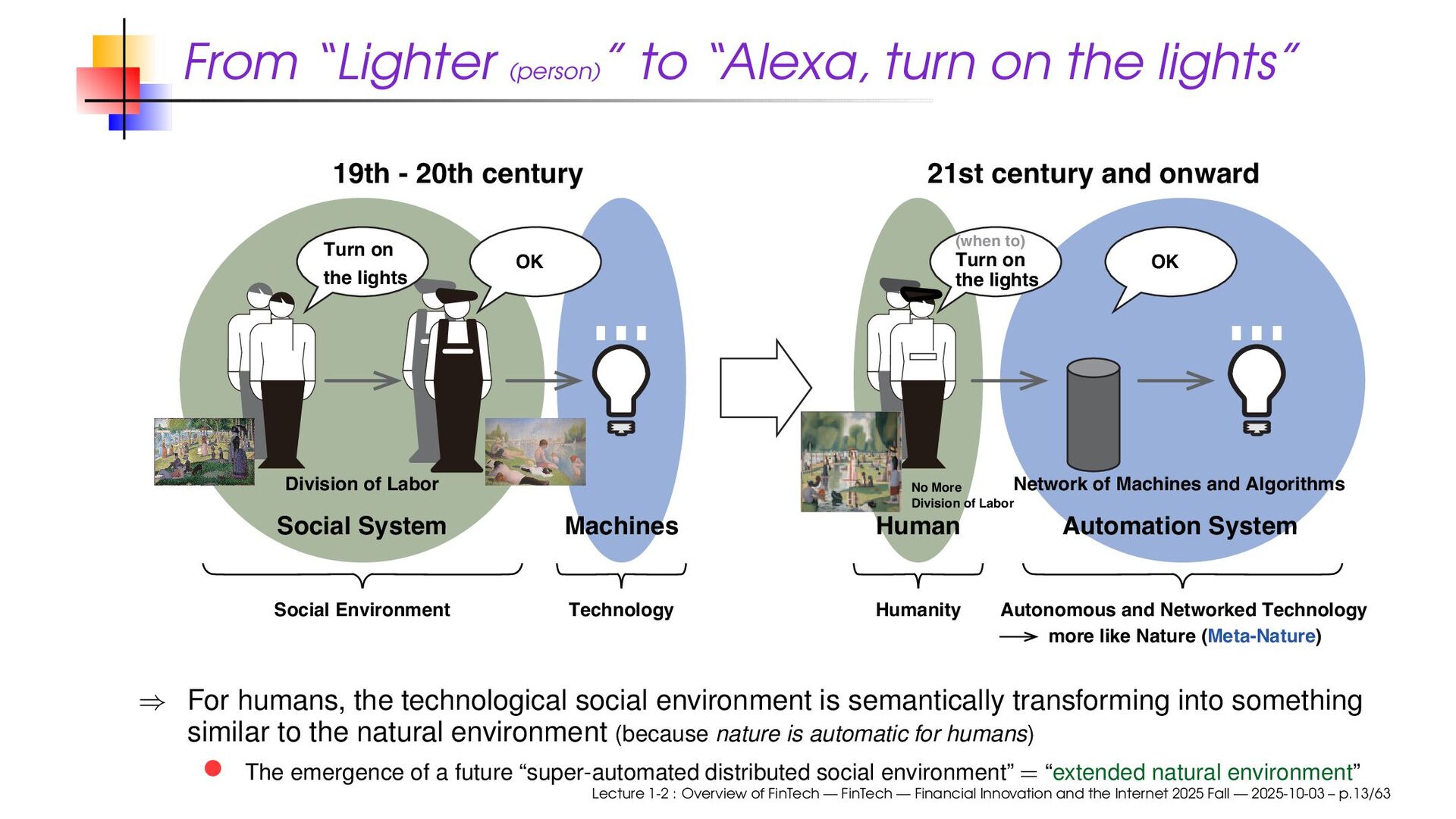 19th - 20th century Social System Social Environment Division of Labor No More Division of Labor Network of Machines and Algorithms Machines Technology Human Automation System 21st century and onward OK OK (when to) Turn on the lights Autonomous and Networked Technology Humanity more like Nature (Meta-Nature) Turn on the lights ⇒ For humans, the technological social environment is semantically transforming into something similar to the natural environment (because nature is automatic for humans) The emergence of a future “super-automated distributed social environment” = “extended natural environment” Lecture 1-2 : Overview of FinTech — FinTech — Financial Innovation and the Internet 2025 Fall — 2025-10-03 – p.13/63