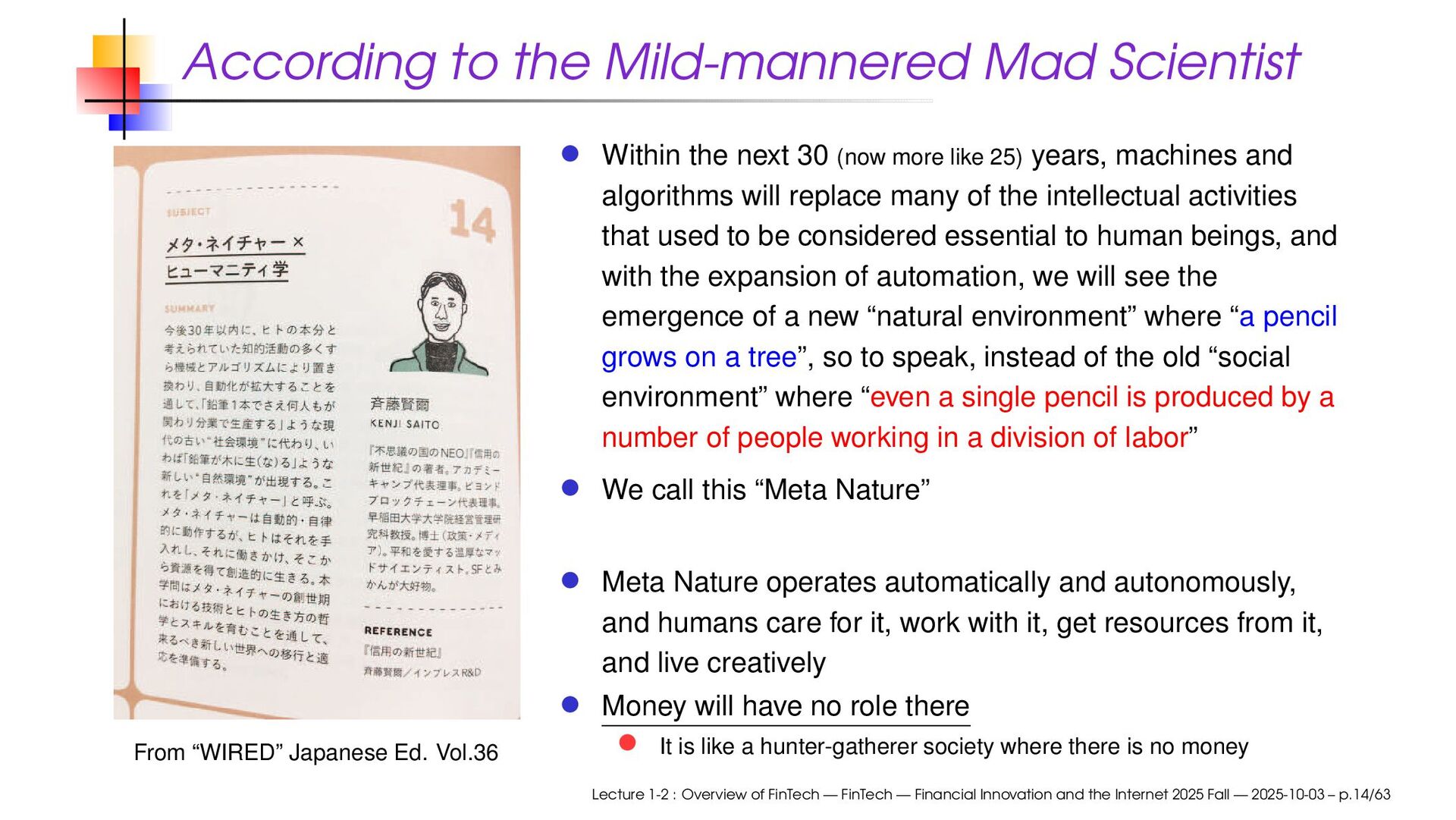 Vol.36 Within the next 30 (now more like 25) years, machines and algorithms will replace many of the intellectual activities that used to be considered essential to human beings, and with the expansion of automation, we will see the emergence of a new “natural environment” where “a pencil grows on a tree”, so to speak, instead of the old “social environment” where “even a single pencil is produced by a number of people working in a division of labor” We call this “Meta Nature” Meta Nature operates automatically and autonomously, and humans care for it, work with it, get resources from it, and live creatively Money will have no role there It is like a hunter-gatherer society where there is no money Lecture 1-2 : Overview of FinTech — FinTech — Financial Innovation and the Internet 2025 Fall — 2025-10-03 – p.14/63