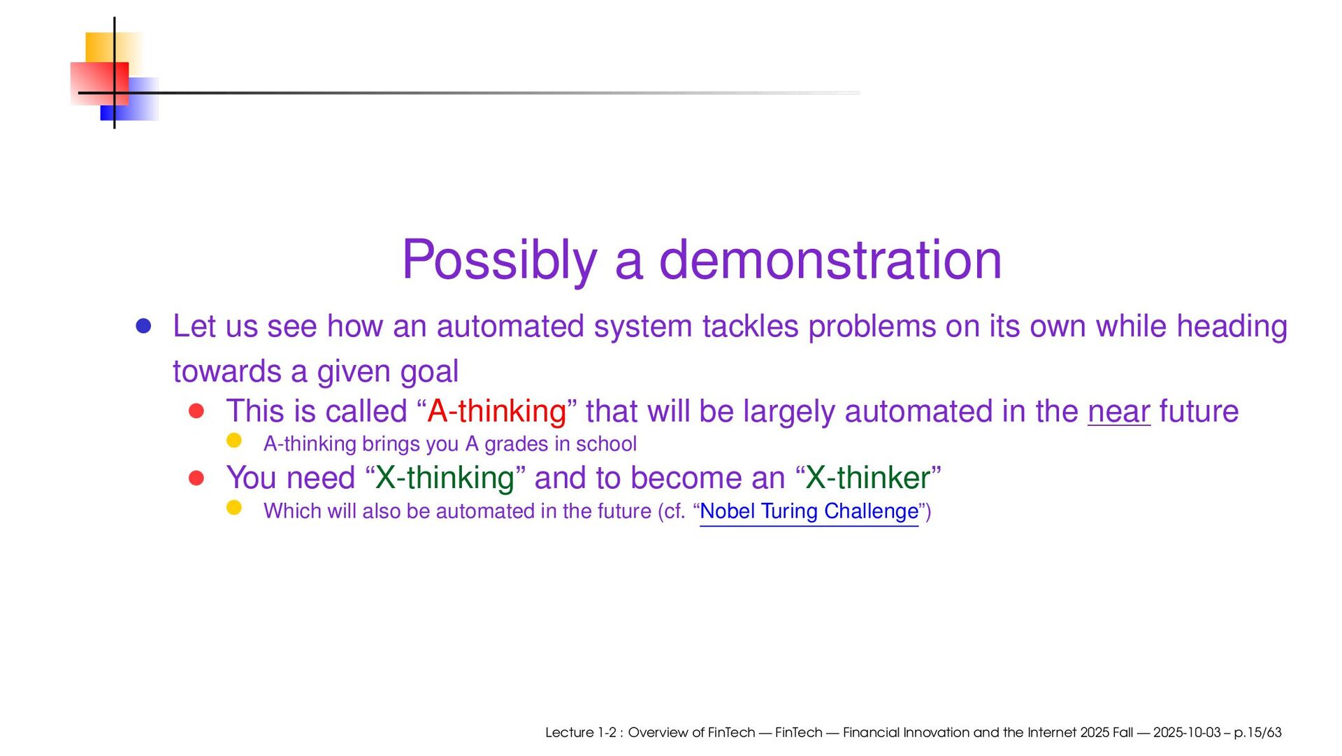 tackles problems on its own while heading towards a given goal This is called “A-thinking” that will be largely automated in the near future A-thinking brings you A grades in school You need “X-thinking” and to become an “X-thinker” Which will also be automated in the future (cf. “Nobel Turing Challenge”) Lecture 1-2 : Overview of FinTech — FinTech — Financial Innovation and the Internet 2025 Fall — 2025-10-03 – p.15/63
