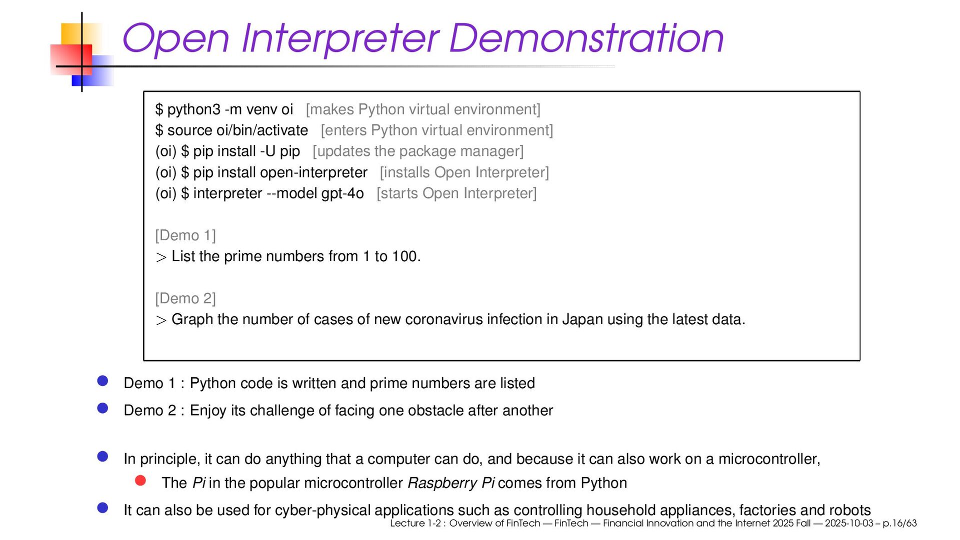 virtual environment] $ source oi/bin/activate [enters Python virtual environment] (oi) $ pip install -U pip [updates the package manager] (oi) $ pip install open-interpreter [installs Open Interpreter] (oi) $ interpreter --model gpt-4o [starts Open Interpreter] [Demo 1] > List the prime numbers from 1 to 100. [Demo 2] > Graph the number of cases of new coronavirus infection in Japan using the latest data. Demo 1 : Python code is written and prime numbers are listed Demo 2 : Enjoy its challenge of facing one obstacle after another In principle, it can do anything that a computer can do, and because it can also work on a microcontroller, The Pi in the popular microcontroller Raspberry Pi comes from Python It can also be used for cyber-physical applications such as controlling household appliances, factories and robots Lecture 1-2 : Overview of FinTech — FinTech — Financial Innovation and the Internet 2025 Fall — 2025-10-03 – p.16/63