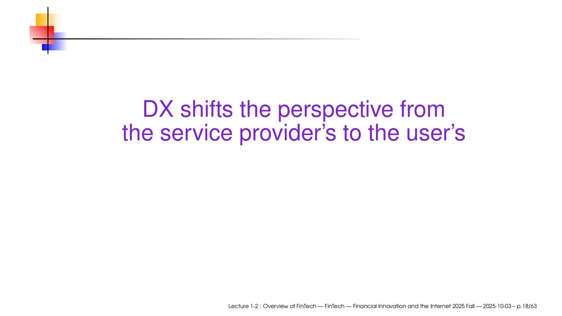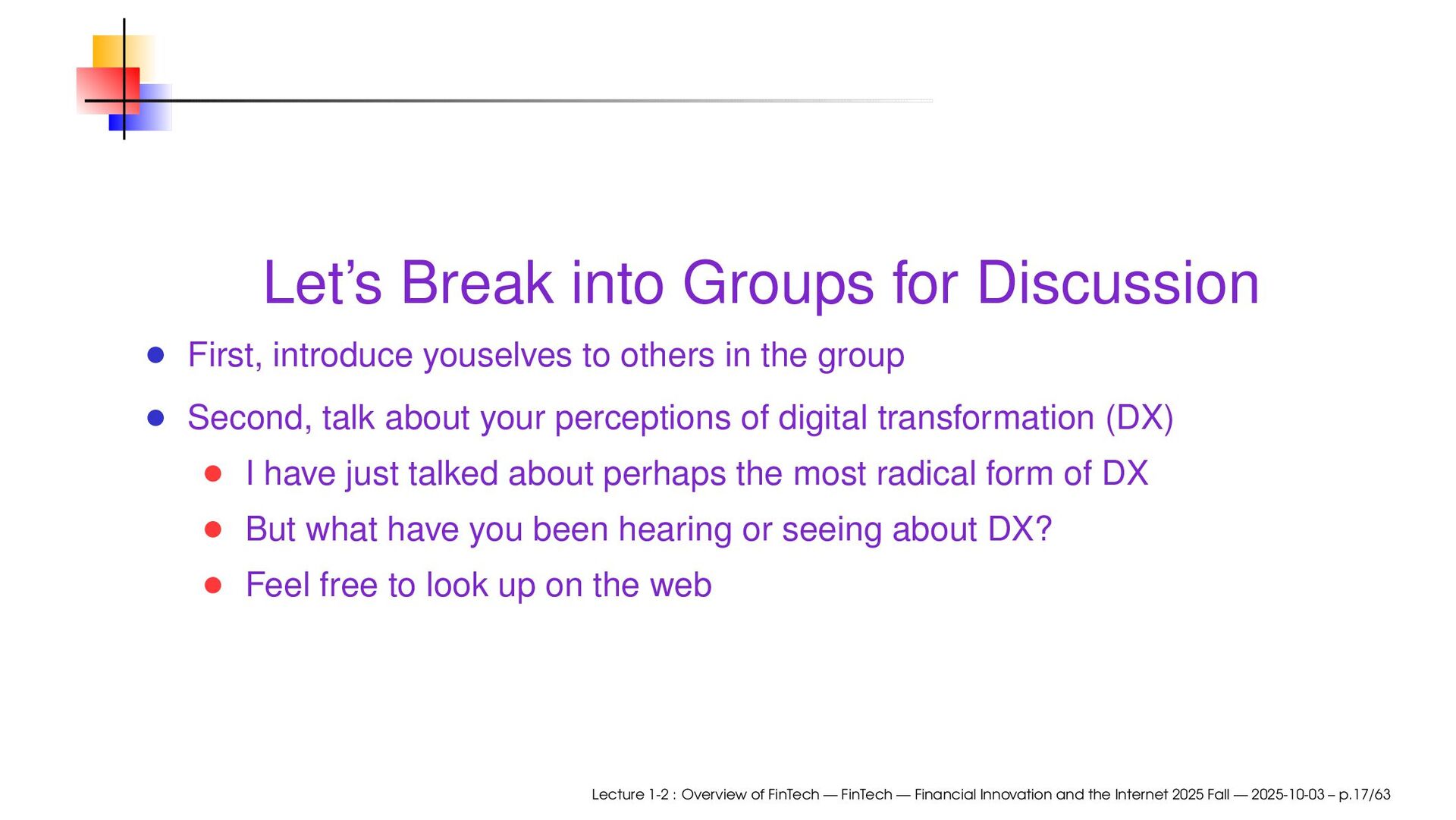 others in the group Second, talk about your perceptions of digital transformation (DX) I have just talked about perhaps the most radical form of DX But what have you been hearing or seeing about DX? Feel free to look up on the web Lecture 1-2 : Overview of FinTech — FinTech — Financial Innovation and the Internet 2025 Fall — 2025-10-03 – p.17/63