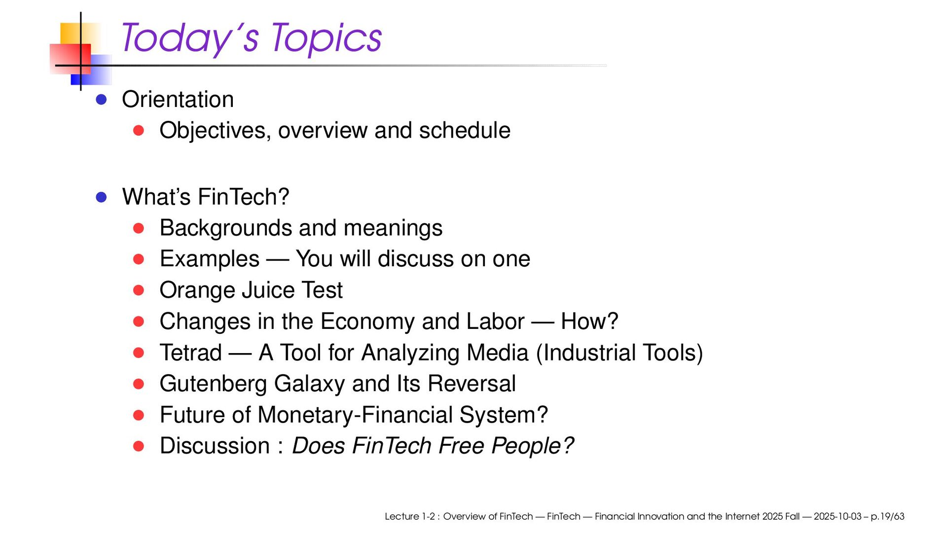 and meanings Examples — You will discuss on one Orange Juice Test Changes in the Economy and Labor — How? Tetrad — A Tool for Analyzing Media (Industrial Tools) Gutenberg Galaxy and Its Reversal Future of Monetary-Financial System? Discussion : Does FinTech Free People? Lecture 1-2 : Overview of FinTech — FinTech — Financial Innovation and the Internet 2025 Fall — 2025-10-03 – p.19/63