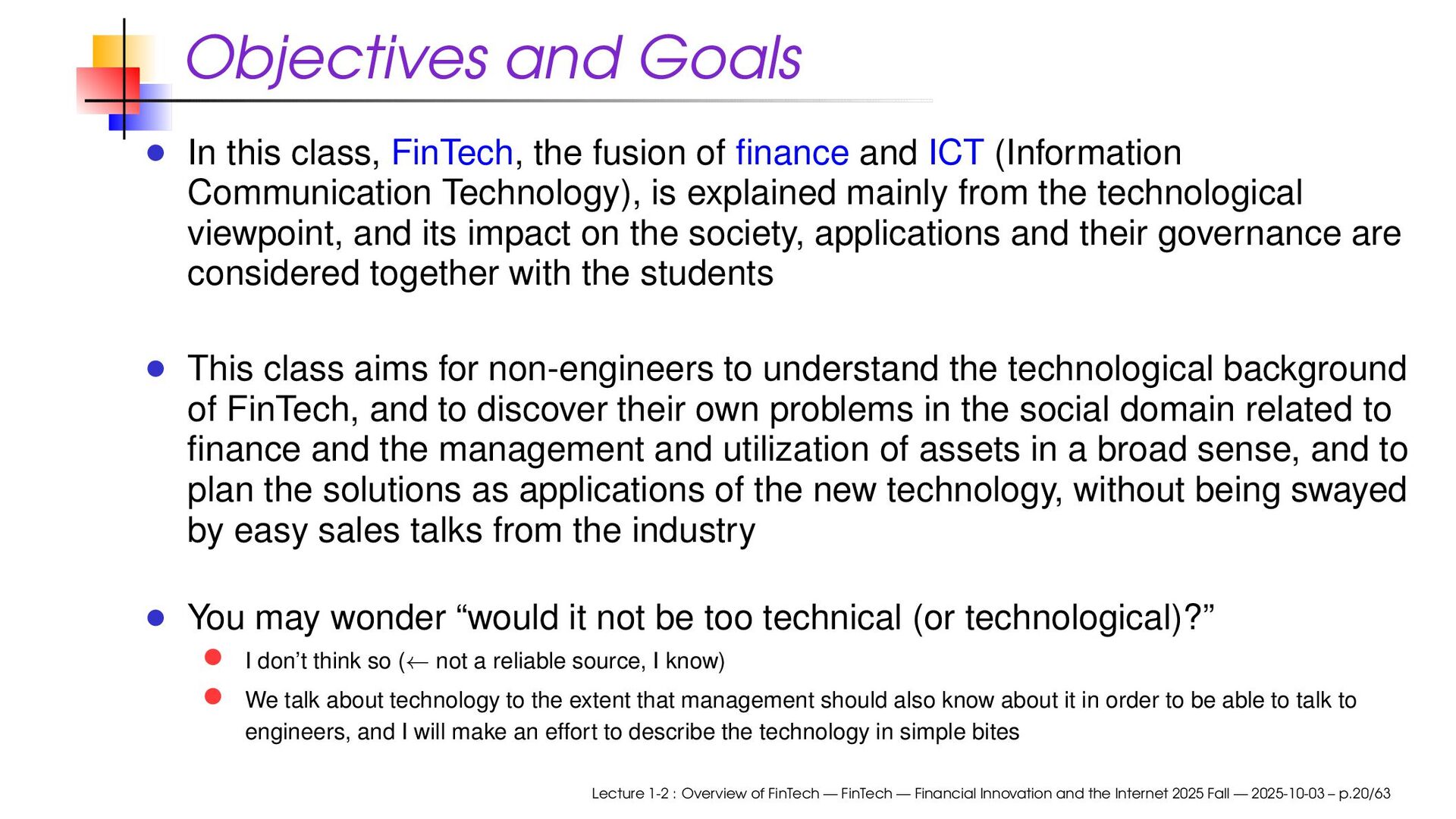 finance and ICT (Information Communication Technology), is explained mainly from the technological viewpoint, and its impact on the society, applications and their governance are considered together with the students This class aims for non-engineers to understand the technological background of FinTech, and to discover their own problems in the social domain related to finance and the management and utilization of assets in a broad sense, and to plan the solutions as applications of the new technology, without being swayed by easy sales talks from the industry You may wonder “would it not be too technical (or technological)?” I don’t think so (← not a reliable source, I know) We talk about technology to the extent that management should also know about it in order to be able to talk to engineers, and I will make an effort to describe the technology in simple bites Lecture 1-2 : Overview of FinTech — FinTech — Financial Innovation and the Internet 2025 Fall — 2025-10-03 – p.20/63