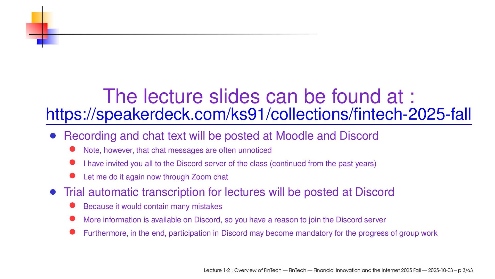 and chat text will be posted at Moodle and Discord Note, however, that chat messages are often unnoticed I have invited you all to the Discord server of the class (continued from the past years) Let me do it again now through Zoom chat Trial automatic transcription for lectures will be posted at Discord Because it would contain many mistakes More information is available on Discord, so you have a reason to join the Discord server Furthermore, in the end, participation in Discord may become mandatory for the progress of group work Lecture 1-2 : Overview of FinTech — FinTech — Financial Innovation and the Internet 2025 Fall — 2025-10-03 – p.3/63