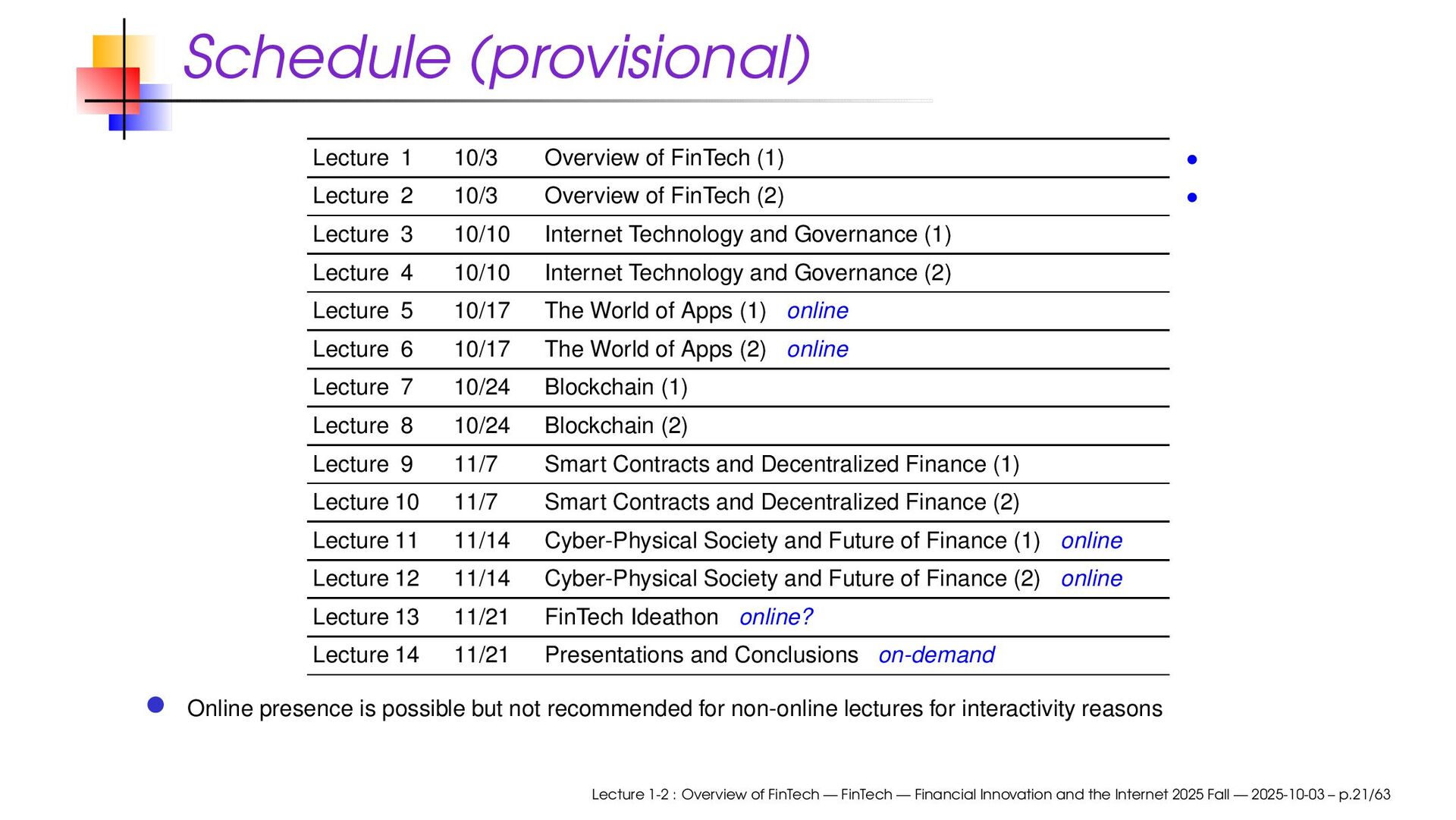 Lecture 2 10/3 Overview of FinTech (2) • Lecture 3 10/10 Internet Technology and Governance (1) Lecture 4 10/10 Internet Technology and Governance (2) Lecture 5 10/17 The World of Apps (1) online Lecture 6 10/17 The World of Apps (2) online Lecture 7 10/24 Blockchain (1) Lecture 8 10/24 Blockchain (2) Lecture 9 11/7 Smart Contracts and Decentralized Finance (1) Lecture 10 11/7 Smart Contracts and Decentralized Finance (2) Lecture 11 11/14 Cyber-Physical Society and Future of Finance (1) online Lecture 12 11/14 Cyber-Physical Society and Future of Finance (2) online Lecture 13 11/21 FinTech Ideathon online? Lecture 14 11/21 Presentations and Conclusions on-demand Online presence is possible but not recommended for non-online lectures for interactivity reasons Lecture 1-2 : Overview of FinTech — FinTech — Financial Innovation and the Internet 2025 Fall — 2025-10-03 – p.21/63