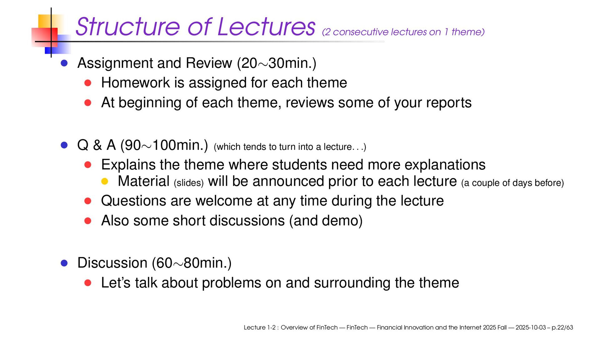 and Review (20∼30min.) Homework is assigned for each theme At beginning of each theme, reviews some of your reports Q & A (90∼100min.) (which tends to turn into a lecture. . .) Explains the theme where students need more explanations Material (slides) will be announced prior to each lecture (a couple of days before) Questions are welcome at any time during the lecture Also some short discussions (and demo) Discussion (60∼80min.) Let’s talk about problems on and surrounding the theme Lecture 1-2 : Overview of FinTech — FinTech — Financial Innovation and the Internet 2025 Fall — 2025-10-03 – p.22/63
