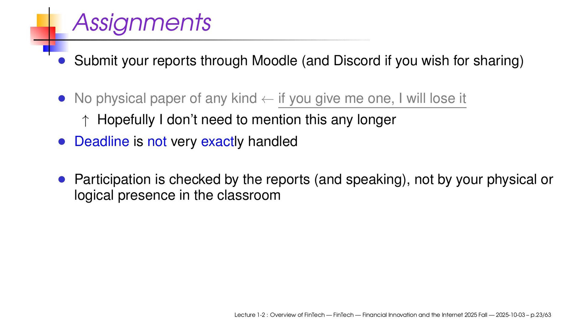 wish for sharing) No physical paper of any kind ← if you give me one, I will lose it ↑ Hopefully I don’t need to mention this any longer Deadline is not very exactly handled Participation is checked by the reports (and speaking), not by your physical or logical presence in the classroom Lecture 1-2 : Overview of FinTech — FinTech — Financial Innovation and the Internet 2025 Fall — 2025-10-03 – p.23/63