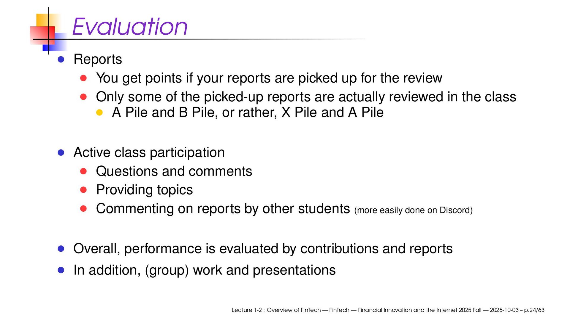 up for the review Only some of the picked-up reports are actually reviewed in the class A Pile and B Pile, or rather, X Pile and A Pile Active class participation Questions and comments Providing topics Commenting on reports by other students (more easily done on Discord) Overall, performance is evaluated by contributions and reports In addition, (group) work and presentations Lecture 1-2 : Overview of FinTech — FinTech — Financial Innovation and the Internet 2025 Fall — 2025-10-03 – p.24/63