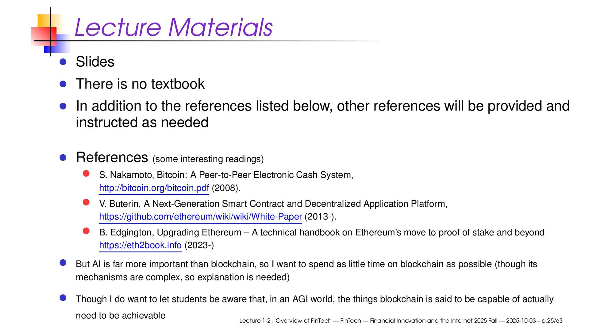 the references listed below, other references will be provided and instructed as needed References (some interesting readings) S. Nakamoto, Bitcoin: A Peer-to-Peer Electronic Cash System, http://bitcoin.org/bitcoin.pdf (2008). V. Buterin, A Next-Generation Smart Contract and Decentralized Application Platform, https://github.com/ethereum/wiki/wiki/White-Paper (2013-). B. Edgington, Upgrading Ethereum – A technical handbook on Ethereum’s move to proof of stake and beyond https://eth2book.info (2023-) But AI is far more important than blockchain, so I want to spend as little time on blockchain as possible (though its mechanisms are complex, so explanation is needed) Though I do want to let students be aware that, in an AGI world, the things blockchain is said to be capable of actually need to be achievable Lecture 1-2 : Overview of FinTech — FinTech — Financial Innovation and the Internet 2025 Fall — 2025-10-03 – p.25/63