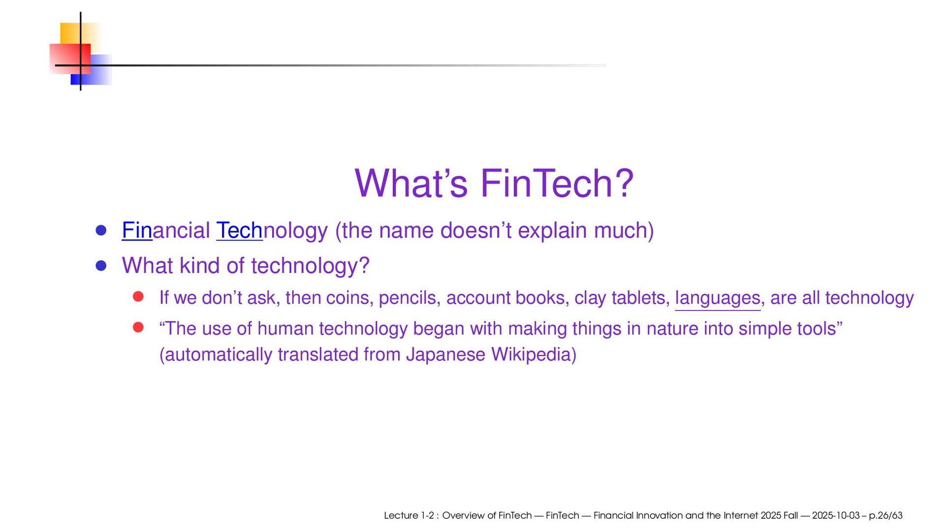 kind of technology? If we don’t ask, then coins, pencils, account books, clay tablets, languages, are all technology “The use of human technology began with making things in nature into simple tools” (automatically translated from Japanese Wikipedia) Lecture 1-2 : Overview of FinTech — FinTech — Financial Innovation and the Internet 2025 Fall — 2025-10-03 – p.26/63