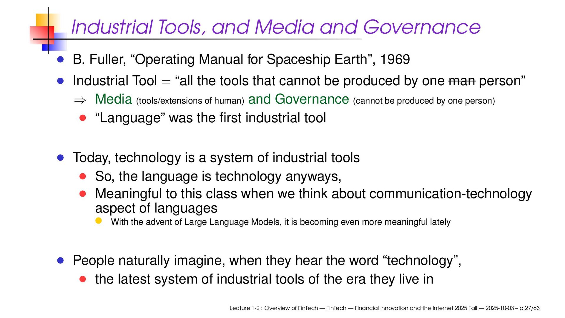 for Spaceship Earth”, 1969 Industrial Tool = “all the tools that cannot be produced by one man person” ⇒ Media (tools/extensions of human) and Governance (cannot be produced by one person) “Language” was the first industrial tool Today, technology is a system of industrial tools So, the language is technology anyways, Meaningful to this class when we think about communication-technology aspect of languages With the advent of Large Language Models, it is becoming even more meaningful lately People naturally imagine, when they hear the word “technology”, the latest system of industrial tools of the era they live in Lecture 1-2 : Overview of FinTech — FinTech — Financial Innovation and the Internet 2025 Fall — 2025-10-03 – p.27/63