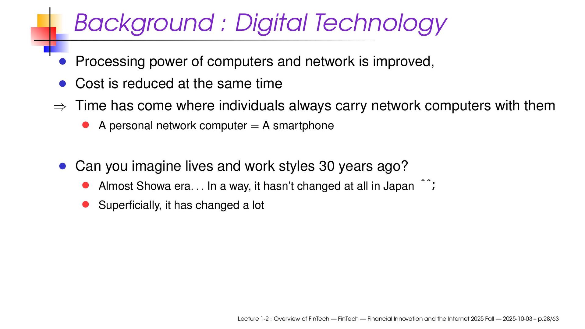 is improved, Cost is reduced at the same time ⇒ Time has come where individuals always carry network computers with them A personal network computer = A smartphone Can you imagine lives and work styles 30 years ago? Almost Showa era . . . In a way, it hasn’t changed at all in Japan Superficially, it has changed a lot Lecture 1-2 : Overview of FinTech — FinTech — Financial Innovation and the Internet 2025 Fall — 2025-10-03 – p.28/63