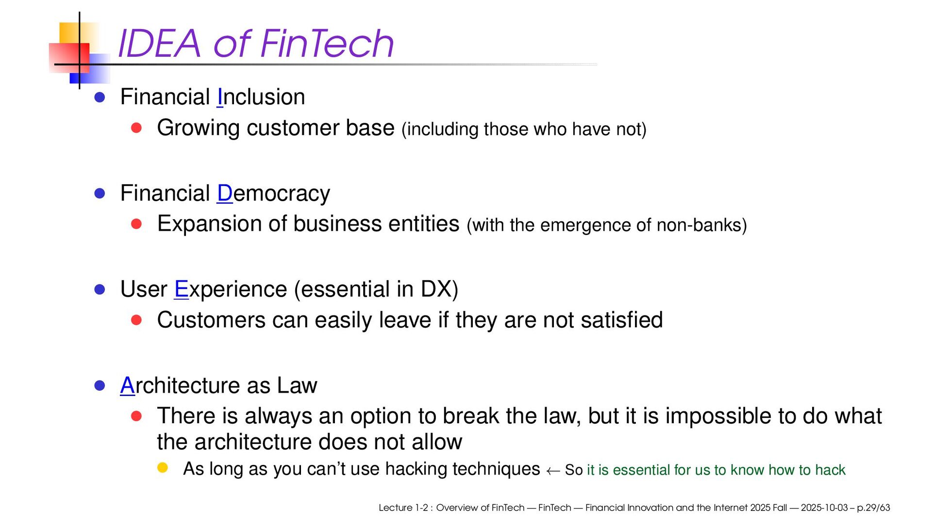 who have not) Financial Democracy Expansion of business entities (with the emergence of non-banks) User Experience (essential in DX) Customers can easily leave if they are not satisfied Architecture as Law There is always an option to break the law, but it is impossible to do what the architecture does not allow As long as you can’t use hacking techniques ← So it is essential for us to know how to hack Lecture 1-2 : Overview of FinTech — FinTech — Financial Innovation and the Internet 2025 Fall — 2025-10-03 – p.29/63