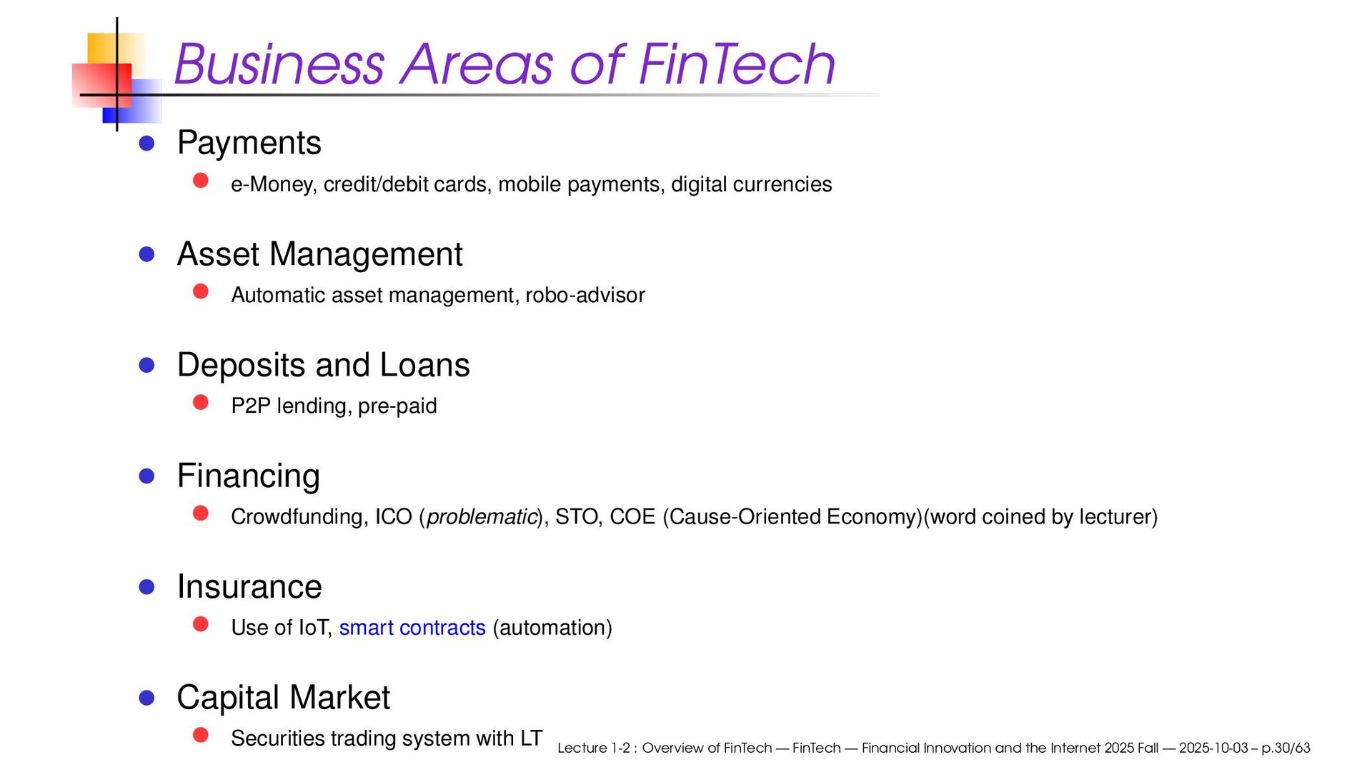 digital currencies Asset Management Automatic asset management, robo-advisor Deposits and Loans P2P lending, pre-paid Financing Crowdfunding, ICO (problematic), STO, COE (Cause-Oriented Economy)(word coined by lecturer) Insurance Use of IoT, smart contracts (automation) Capital Market Securities trading system with LT Lecture 1-2 : Overview of FinTech — FinTech — Financial Innovation and the Internet 2025 Fall — 2025-10-03 – p.30/63