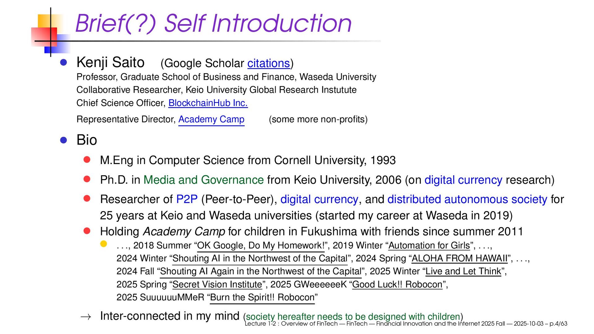 School of Business and Finance, Waseda University Collaborative Researcher, Keio University Global Research Instutute Chief Science Officer, BlockchainHub Inc. Representative Director, Academy Camp (some more non-profits) Bio M.Eng in Computer Science from Cornell University, 1993 Ph.D. in Media and Governance from Keio University, 2006 (on digital currency research) Researcher of P2P (Peer-to-Peer), digital currency, and distributed autonomous society for 25 years at Keio and Waseda universities (started my career at Waseda in 2019) Holding Academy Camp for children in Fukushima with friends since summer 2011 . . ., 2018 Summer “OK Google, Do My Homework!”, 2019 Winter “Automation for Girls”, . . ., 2024 Winter “Shouting AI in the Northwest of the Capital”, 2024 Spring “ALOHA FROM HAWAII”, . . ., 2024 Fall “Shouting AI Again in the Northwest of the Capital”, 2025 Winter “Live and Let Think”, 2025 Spring “Secret Vision Institute”, 2025 GWeeeeeeK “Good Luck!! Robocon”, 2025 SuuuuuuMMeR “Burn the Spirit!! Robocon” → Inter-connected in my mind (society hereafter needs to be designed with children) Lecture 1-2 : Overview of FinTech — FinTech — Financial Innovation and the Internet 2025 Fall — 2025-10-03 – p.4/63