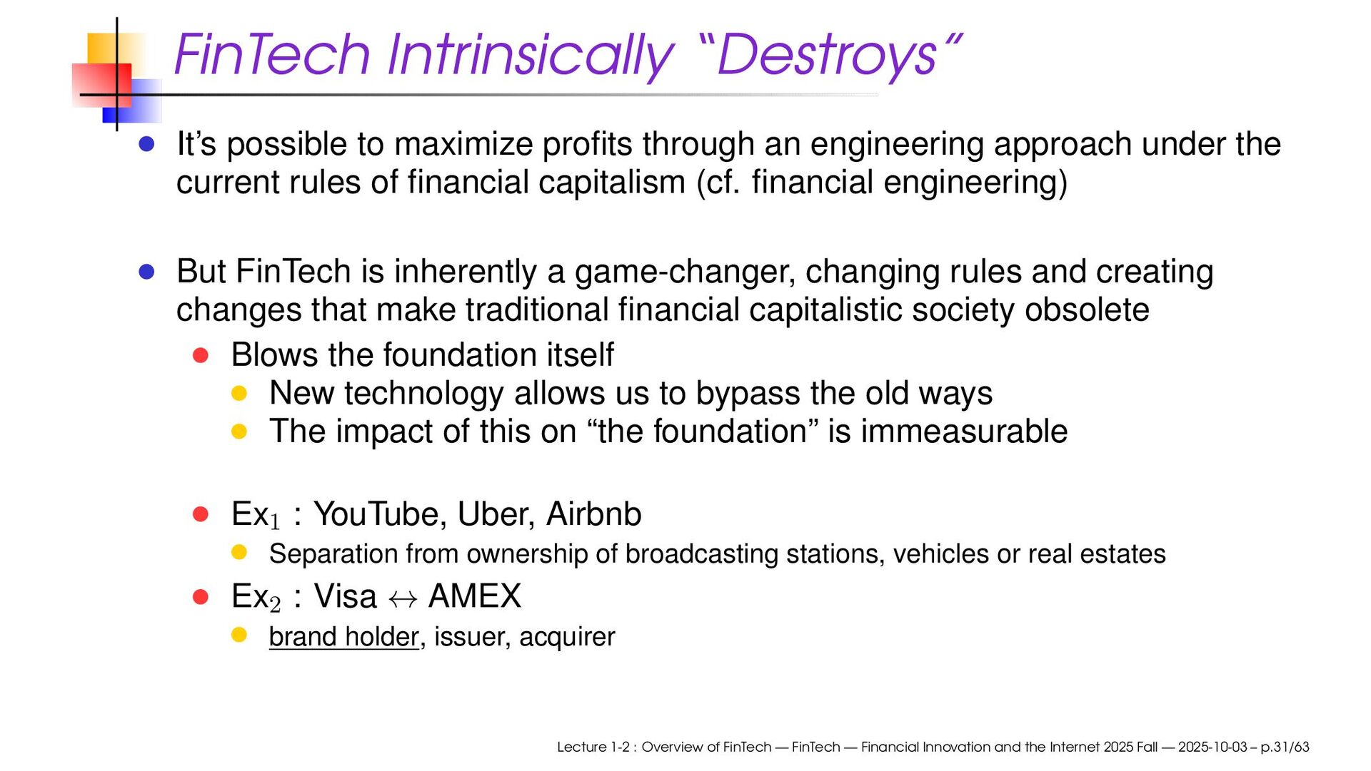 engineering approach under the current rules of financial capitalism (cf. financial engineering) But FinTech is inherently a game-changer, changing rules and creating changes that make traditional financial capitalistic society obsolete Blows the foundation itself New technology allows us to bypass the old ways The impact of this on “the foundation” is immeasurable Ex1 : YouTube, Uber, Airbnb Separation from ownership of broadcasting stations, vehicles or real estates Ex2 : Visa ↔ AMEX brand holder, issuer, acquirer Lecture 1-2 : Overview of FinTech — FinTech — Financial Innovation and the Internet 2025 Fall — 2025-10-03 – p.31/63