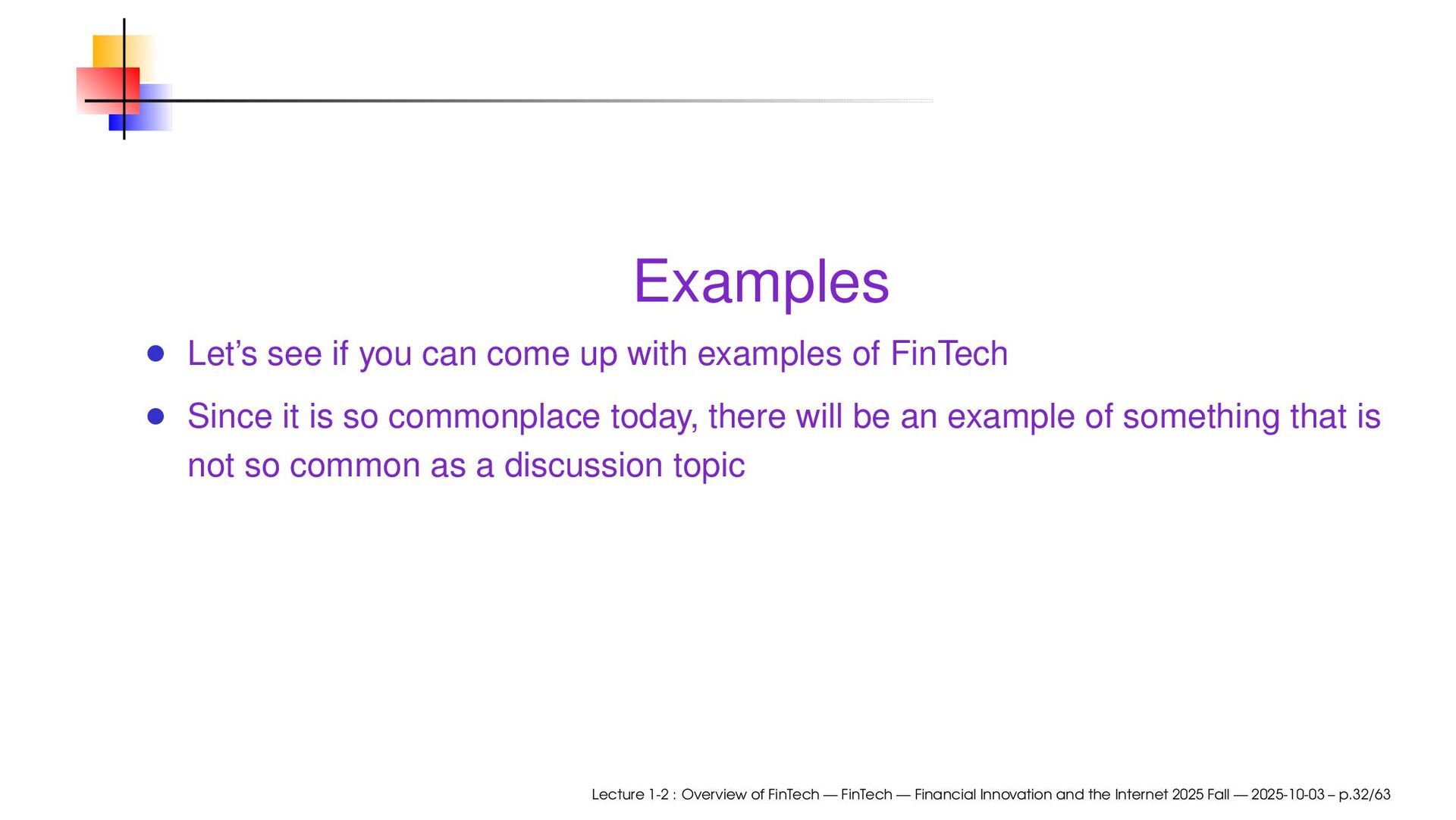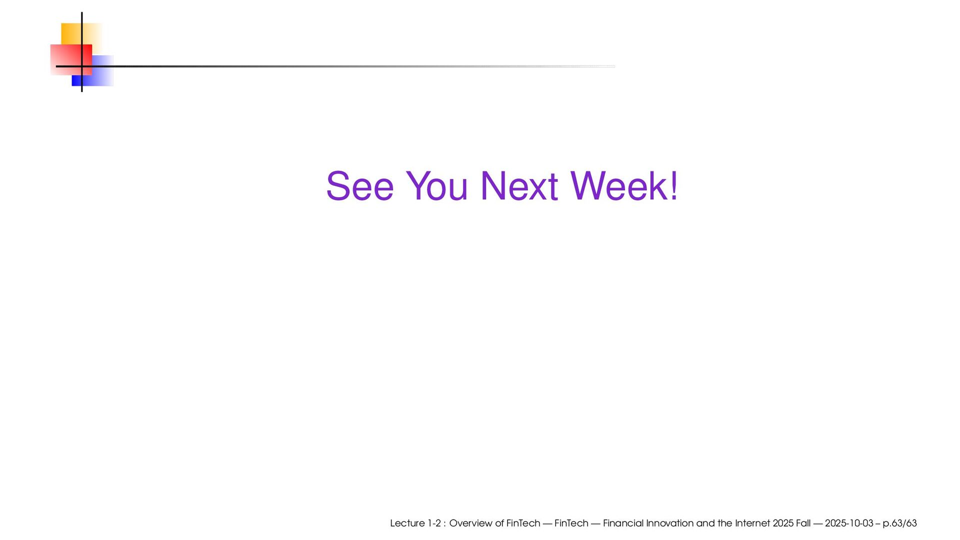 of FinTech Since it is so commonplace today, there will be an example of something that is not so common as a discussion topic Lecture 1-2 : Overview of FinTech — FinTech — Financial Innovation and the Internet 2025 Fall — 2025-10-03 – p.32/63
