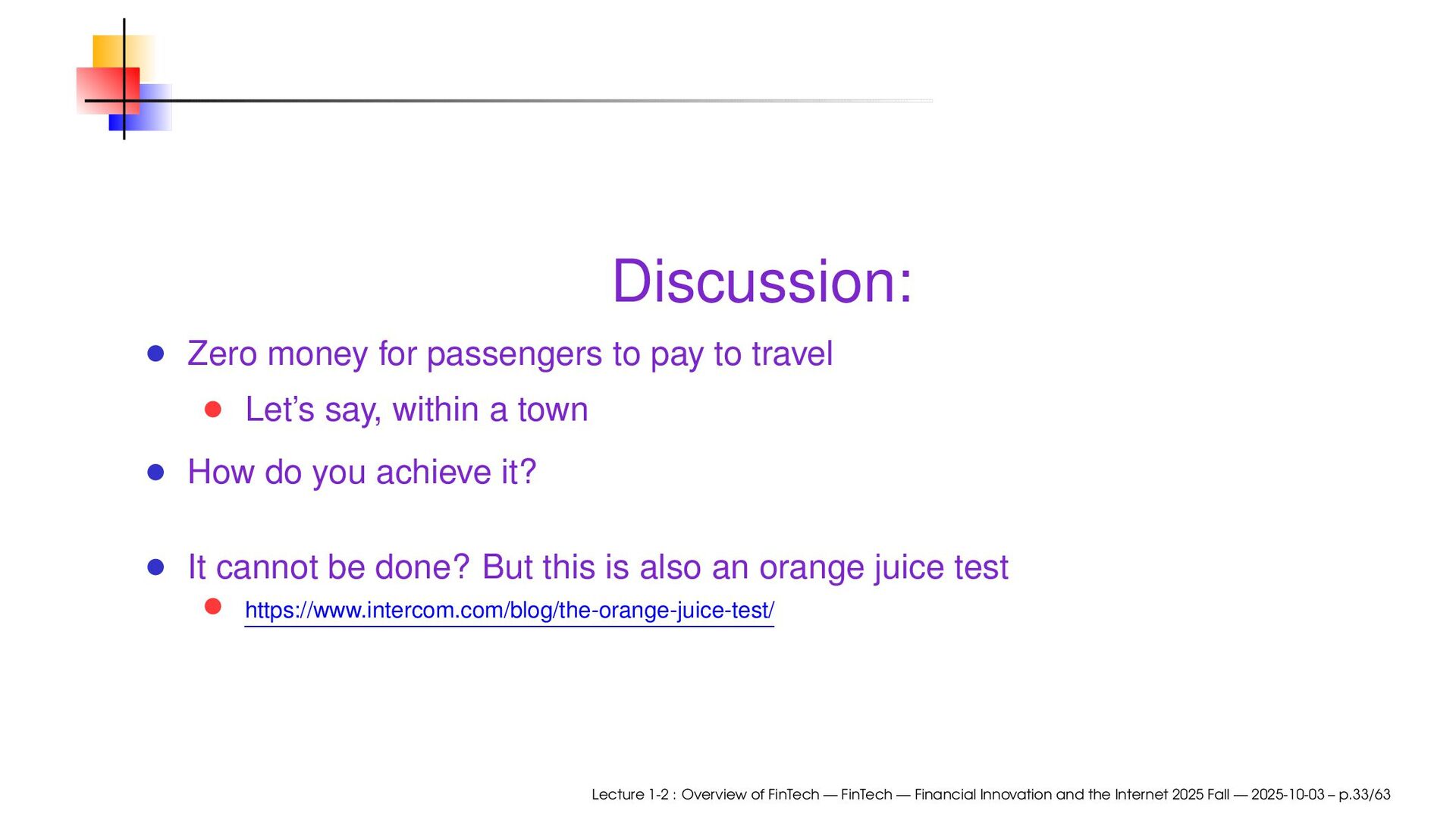 say, within a town How do you achieve it? It cannot be done? But this is also an orange juice test https://www.intercom.com/blog/the-orange-juice-test/ Lecture 1-2 : Overview of FinTech — FinTech — Financial Innovation and the Internet 2025 Fall — 2025-10-03 – p.33/63