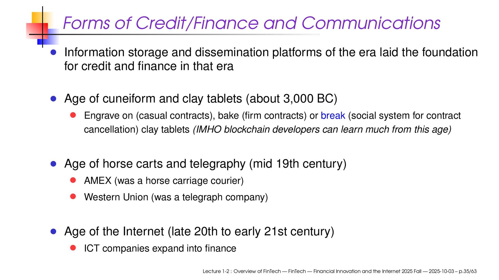 of the era laid the foundation for credit and finance in that era Age of cuneiform and clay tablets (about 3,000 BC) Engrave on (casual contracts), bake (firm contracts) or break (social system for contract cancellation) clay tablets (IMHO blockchain developers can learn much from this age) Age of horse carts and telegraphy (mid 19th century) AMEX (was a horse carriage courier) Western Union (was a telegraph company) Age of the Internet (late 20th to early 21st century) ICT companies expand into finance Lecture 1-2 : Overview of FinTech — FinTech — Financial Innovation and the Internet 2025 Fall — 2025-10-03 – p.35/63