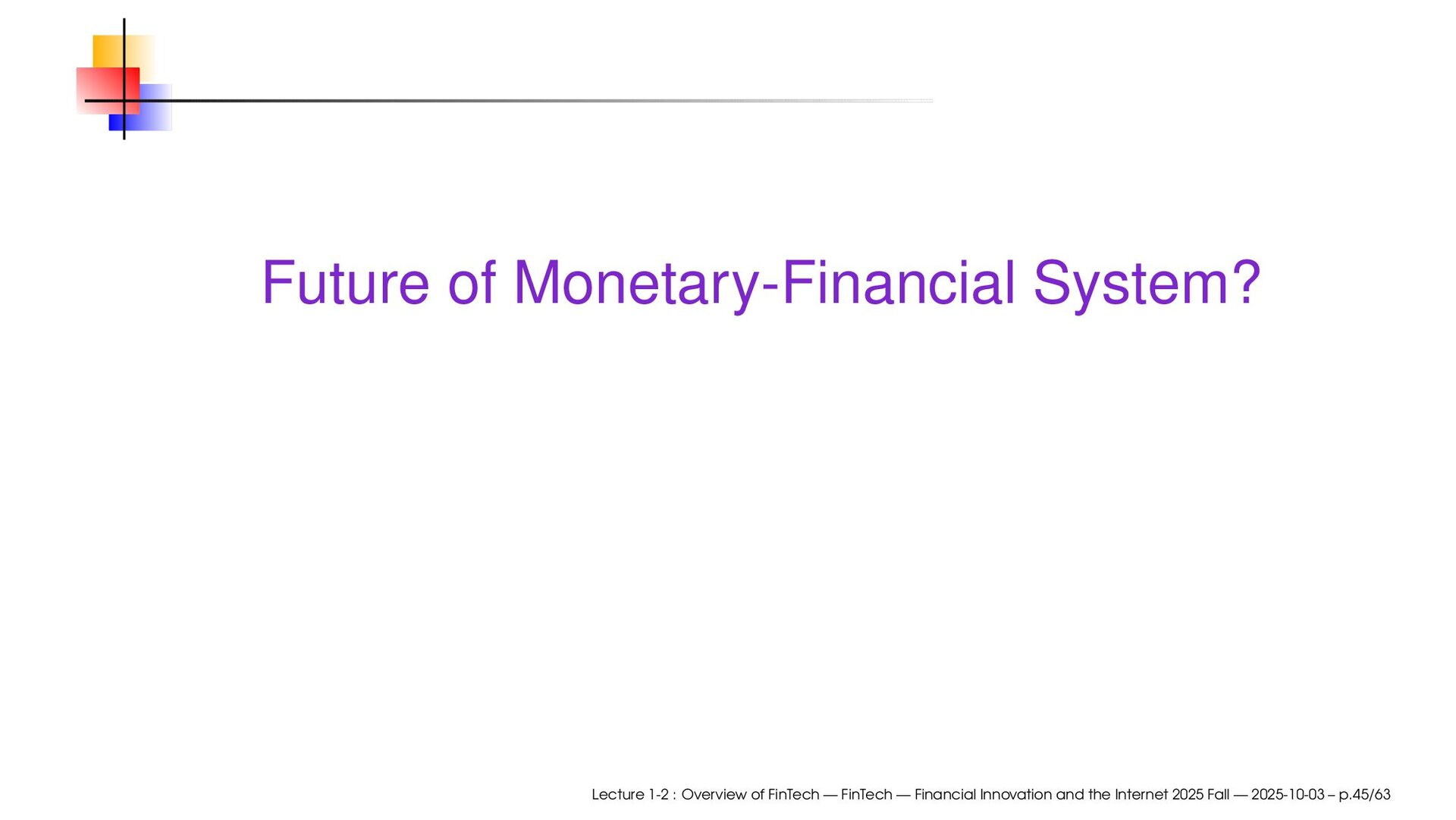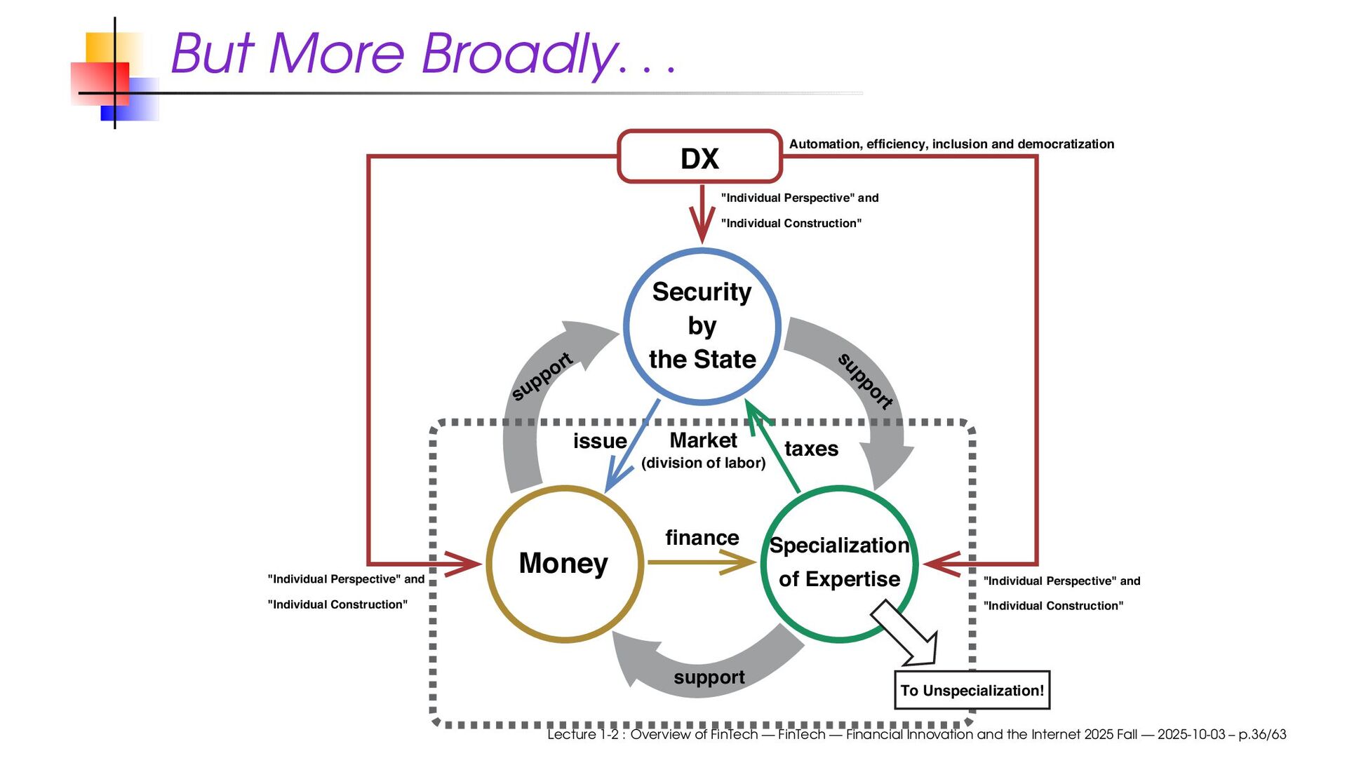 Money Market (division of labor) Specialization of Expertise support support support DX finance issue taxes "Individual Perspective" and "Individual Construction" "Individual Perspective" and "Individual Construction" "Individual Perspective" and "Individual Construction" Automation, efficiency, inclusion and democratization To Unspecialization! Lecture 1-2 : Overview of FinTech — FinTech — Financial Innovation and the Internet 2025 Fall — 2025-10-03 – p.36/63