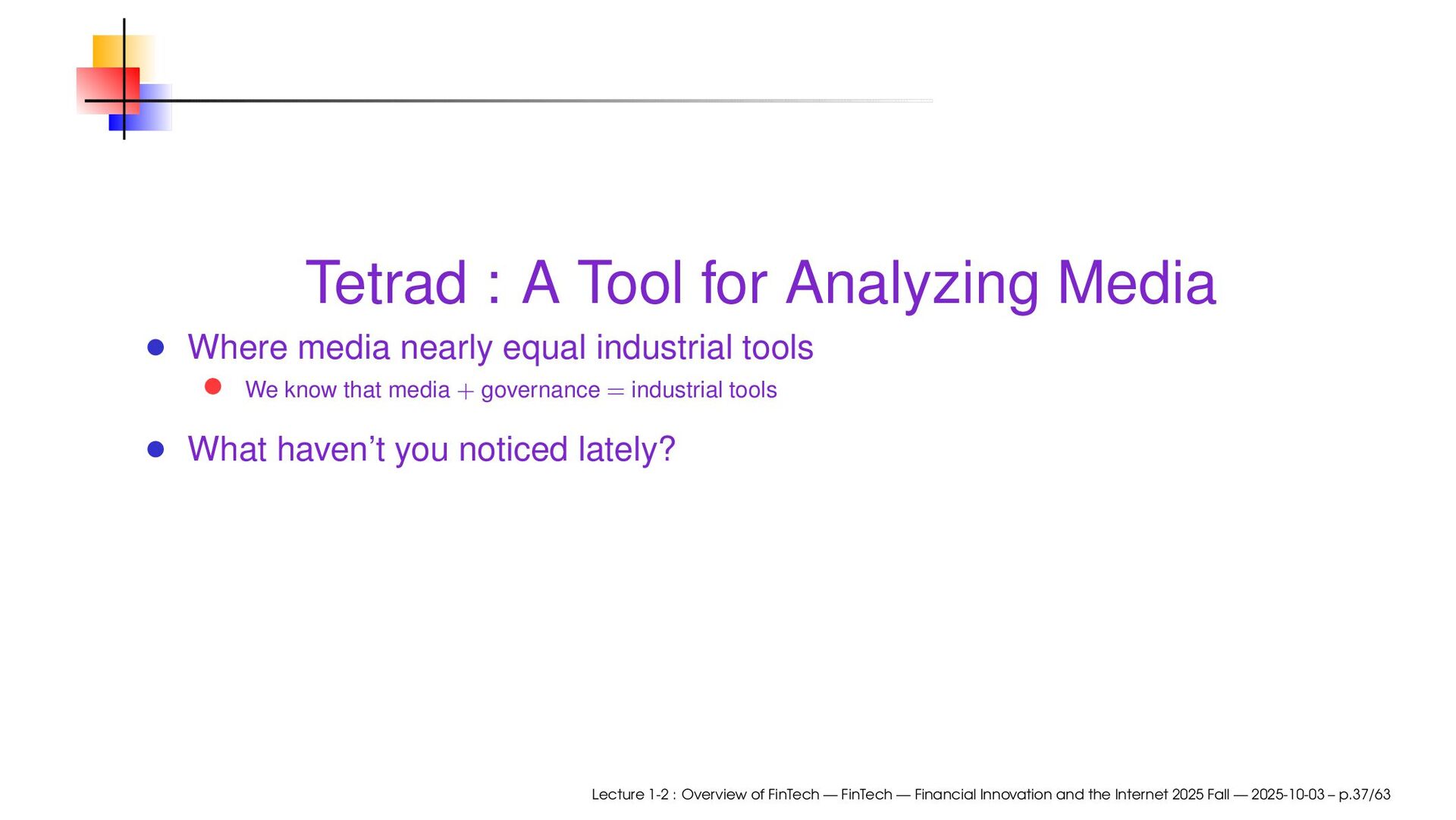 equal industrial tools We know that media + governance = industrial tools What haven’t you noticed lately? Lecture 1-2 : Overview of FinTech — FinTech — Financial Innovation and the Internet 2025 Fall — 2025-10-03 – p.37/63